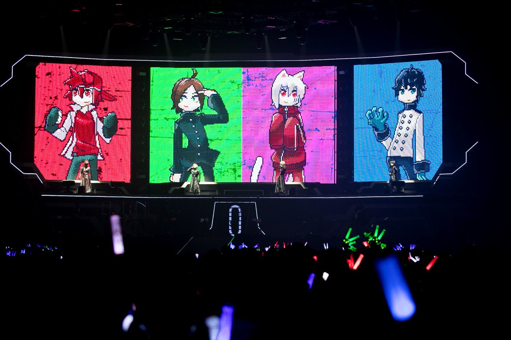 「ARE YOU READY?」を合図にステージ上段に現れた4人。「みなさん、明けましておめでとうございます! 最高の1日にしましょう!」とそらるが挨拶して、1曲目は、昨年末に動画投稿したばかりの、普段一緒にゲームをしている4人によるオリジナル曲第3弾「必殺のコマンド」だ。ヘッドセットマイクをしてそれぞれのイメージカラーをステッチにあしらった黒いロングコートの衣装をまとう4人、その衣装の裾を翻しながらの躍動感あるダンスに、<必殺のコマンドが決定打>に合わせての華麗なキックポーズ、さらにはみんなでステージを駆け回ったり、コントローラーを手に小競り合ったりと、あまりの見どころの多さに俄然高まってしまう。