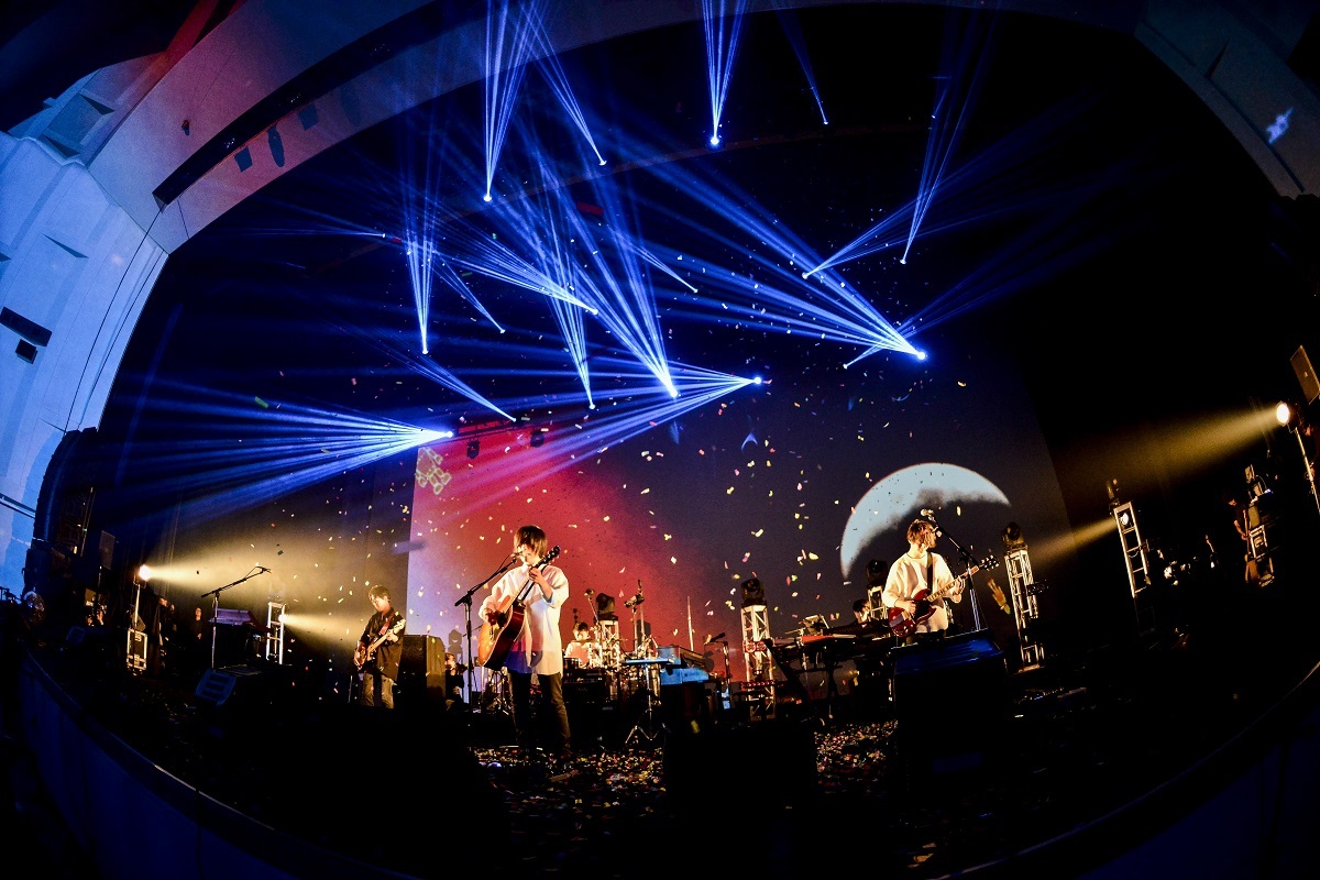 ほぼ発表順に楽曲を披露していくセットリストゆえに、これまで彼らがどんな挑戦をして、どう変わっていったのかがまじまじと伝わってくる。それが色濃く表れ始めたのが、サポートキーボードの森谷優里を迎えて進行し始めたライブ中盤のこと。エレクトロニックなダンスミュージックを大胆なまでに打ち出した「World.Words.Lights.」や、激情的なバンドサウンドを叩きつける「Boohoo」といったタイプの異なる高揚感を持った楽曲や、客席のクラップとシンガロングで幕を開ける「Voice」では、佐藤と前田の2人がステージの前にまで歩み出てきて、内澤も合唱を促すようにメロディーを歌い上げる。さらに、力強く疾走するバンドサウンドがまばゆいまでの光を放つ「One」や、客席に大量の花吹雪が舞った「Yeah! Yeah! Yeah!」と、ライブという空間を通して開かれていった内澤の心境やバンドのモードが刻まれた楽曲達が、次々に繰り出されていった。