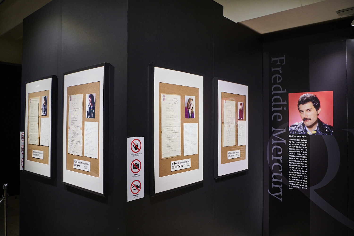 まず初めに、大熱狂を巻き起こした1975年の初来日時に撮影された羽田空港の映像が見られるエントランスを過ぎると、クイーンのオリジナルメンバー4人のプロフィールが紹介されている。ボーカルのフレディ・マーキュリー、ギターのブライアン・メイ、ベースのジョン・ディーコン、ドラムスのロジャー・テイラー。大きなポートレートショットの近くには初来日の直前に4人それぞれが書き残した直筆バイオグラフィーがある。やはり野村さんの視線は自然とブライアンの直筆にフォーカスオン。「ブライアン、好きな食べ物が『車海老』だって。横に菜食主義者って書いてあるのにエビは食べるんだな。フレディなんて『てりやき』だもん(笑)」と来日前の彼らが日本に寄せた“リップサービス”が気になった模様。