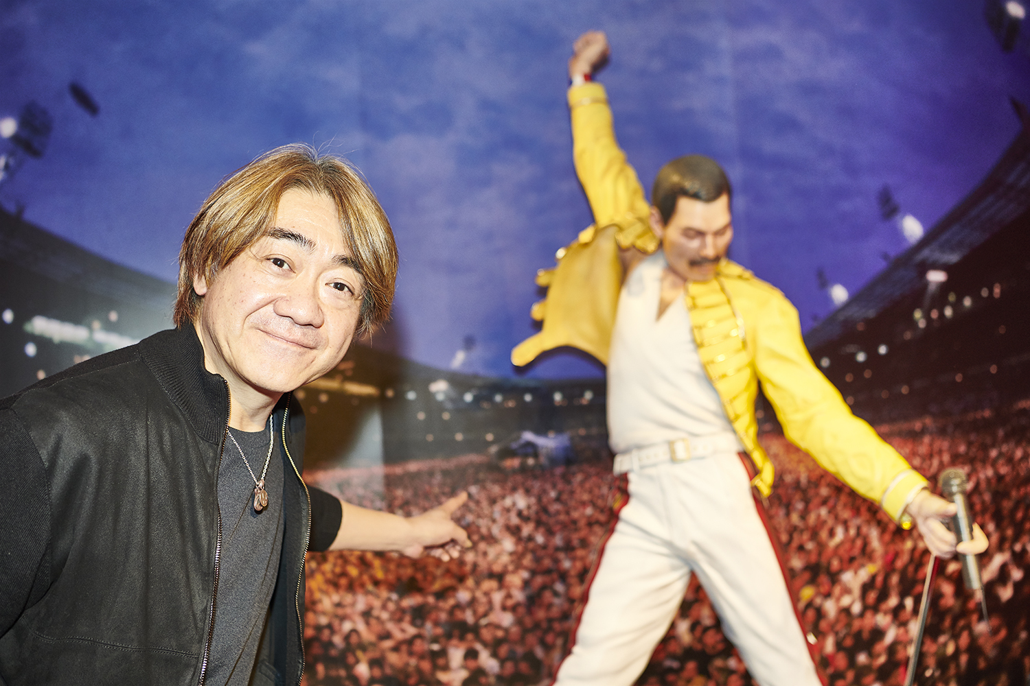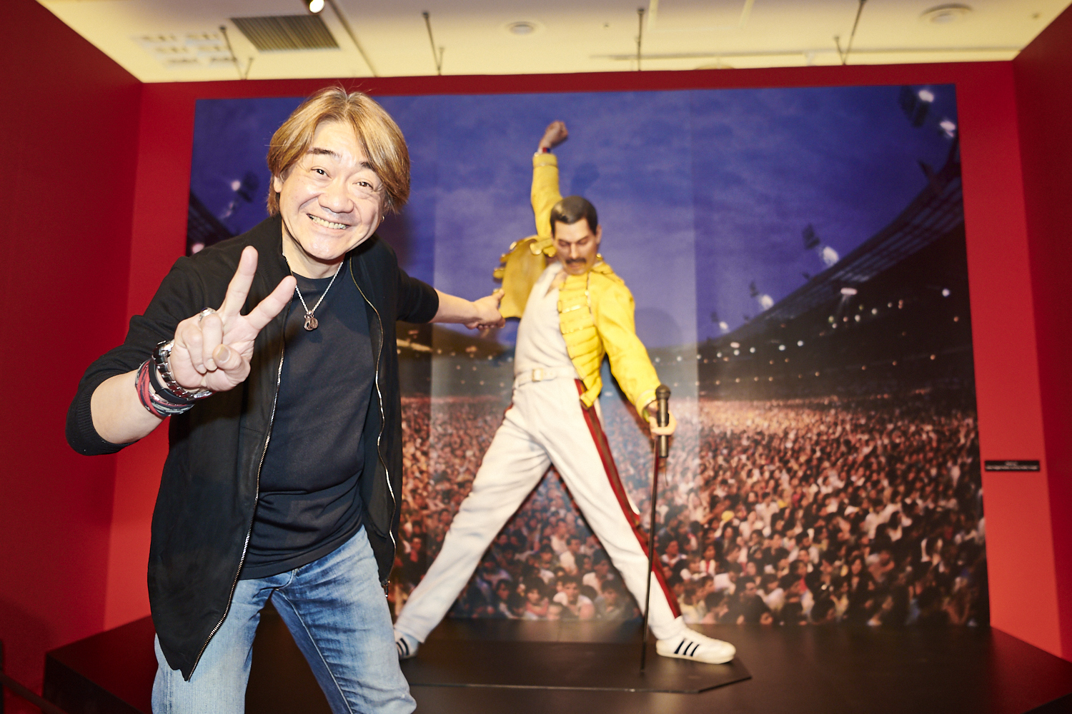 フレディのフィギュアと一緒にノリノリでピース! こちらは一般客も撮影OK。