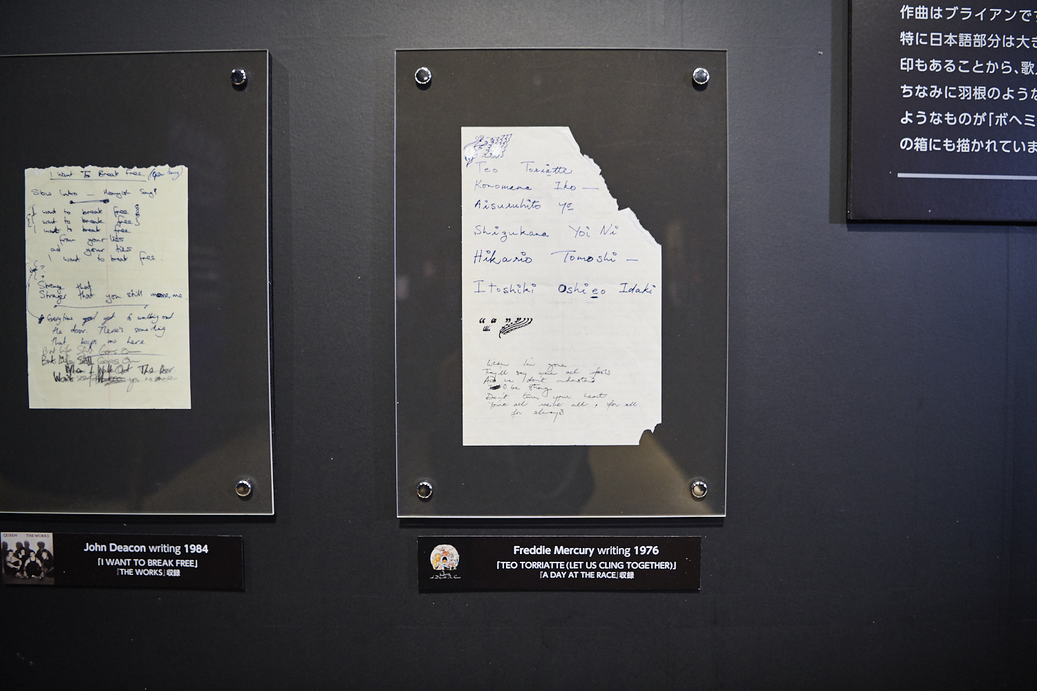 終盤、日本で発売されたシングルレコードのジャケットや4人の手書き歌詞などを経て一連の展示は終了。最後には、大スクリーンによる「ボヘミアン・ラプソディ」「ウィ・ウィル・ロック・ユー」「ウィー・アー・ザ・チャンピオン」という代表曲3連発のライブ映像を見て、テンション最高潮のままグッズ売り場まで楽しんだ野村さんに本展全体を経ての感想を聞いた。
