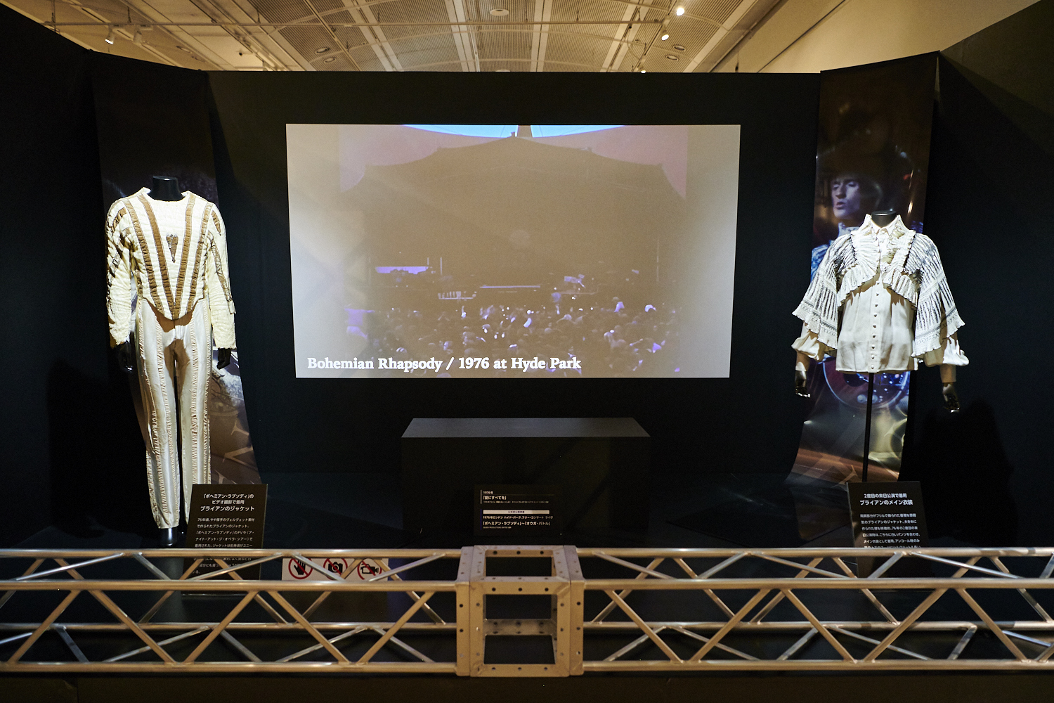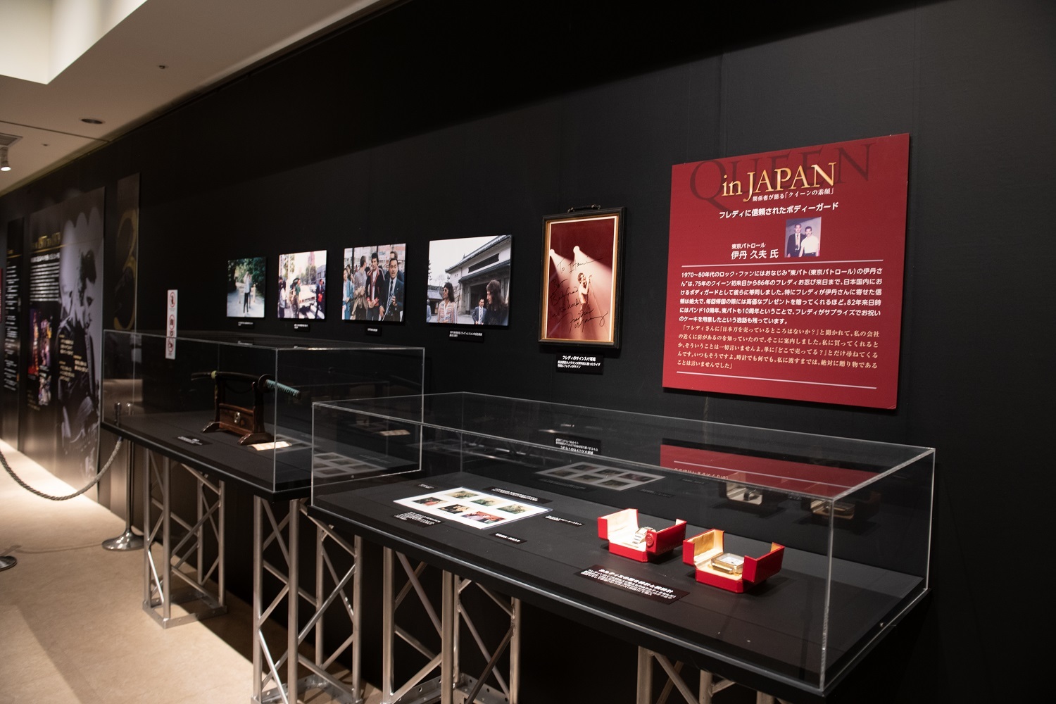 2度の武道館公演を含む全国7都市を巡った75年の日本ツアーのうち、初の武道館公演で演奏された「キラー・クイーン」や「ナウ・アイム・ヒア」の映像。その公演時にも着用していた「白鳥ルック」と呼ばれるフレディのメイン衣装、ブライアンのメイン衣装。そして、アカデミー作品の映画のタイトルにもなった代表曲のひとつ「ボヘミアン・ラプソディ」誕生までのヒストリーを辿るインタビュー映像などを経て、会場の一角には、来日時にフレディを24時間警護したボディガード・伊丹久夫氏の秘蔵品が。