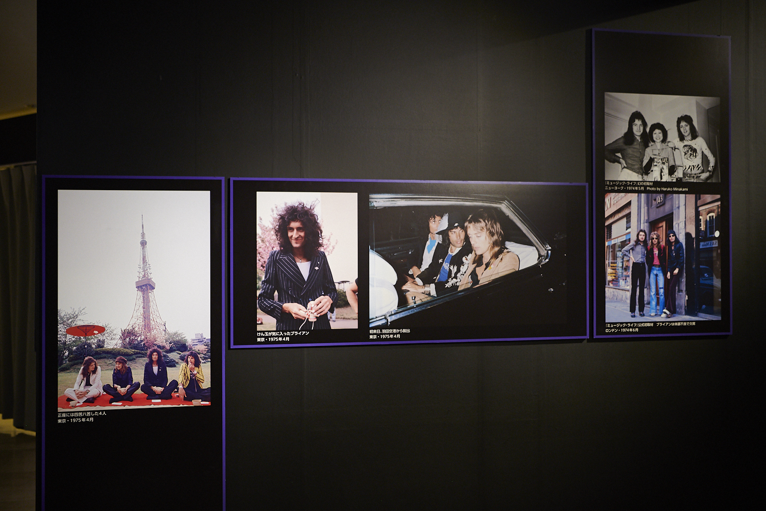 会場の壁を彩る写真は、主に音楽雑誌『ミュージックライフ』のためにカメラマン・長谷部宏氏が撮り下ろしたもの。1970年代はギター小僧だった野村さんも、東京タワーを背景に正座を試みる4人の写真を見て「この写真、ミュージックライフで見たなぁ」と懐かしみながら、その頃の記憶を語ってくれた。
