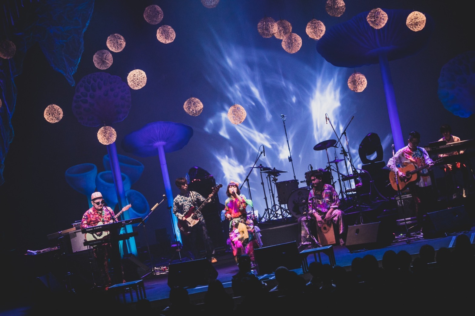 ひろせのラップと観客の「Yeah!」の掛け合いで盛り上がった「NO BITTER LIFE」。Bメロのリズムに合わせメンバーがジャンプする様子も目に楽しい「iをyou」。冒頭3曲はテンポこそゆったりとしているが、バンドのグルーヴやビートがはっきり打ち出されていて、急かされていないのにしっかりノせてくれる感じがある。心地よい高揚感だ。最初のMCではひろせが、この日のセットリストが最新曲も昔の曲も網羅した“神セトリ”であることを宣言。その言葉通り、続く「DIVER」、「とけないよ」は2016年リリースの会場および通販限定盤『ショー・チューン』収録曲である。照明のトーンも落とし、しっとりと届けた2曲を経て、「じゃあ次はみんなで踊ろう!」(えみそん)と始まったのは関口作曲の「Nothing」。往年のディスコソングに通ずる雰囲気のある曲で、メンバーもステップを踏みながら演奏に興じていた。2度目のMCではえみそんが必須アミノ酸を暗唱。人それぞれ覚え方があるが自分は歌で覚えたという話から、リジンを摂るにはたまごを食べるのが良いとか、ゆで卵のゆで時間は9~10分が好みだという話になり……と相変わらずのマイペースっぷり、天然っぷりを発揮する。