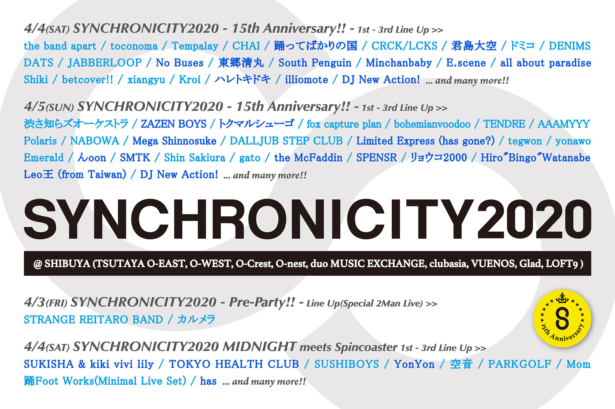 2020年4月3日(金)~4月5日(日)に東京・渋谷にて開催される都市型フェスティバル『SYNCHRONICITY2020 – 15th Anniversary!! -』の第3弾ラインナップと、『SYNCHRONICITY2020 in Taipei』の詳細が明らかとなった。