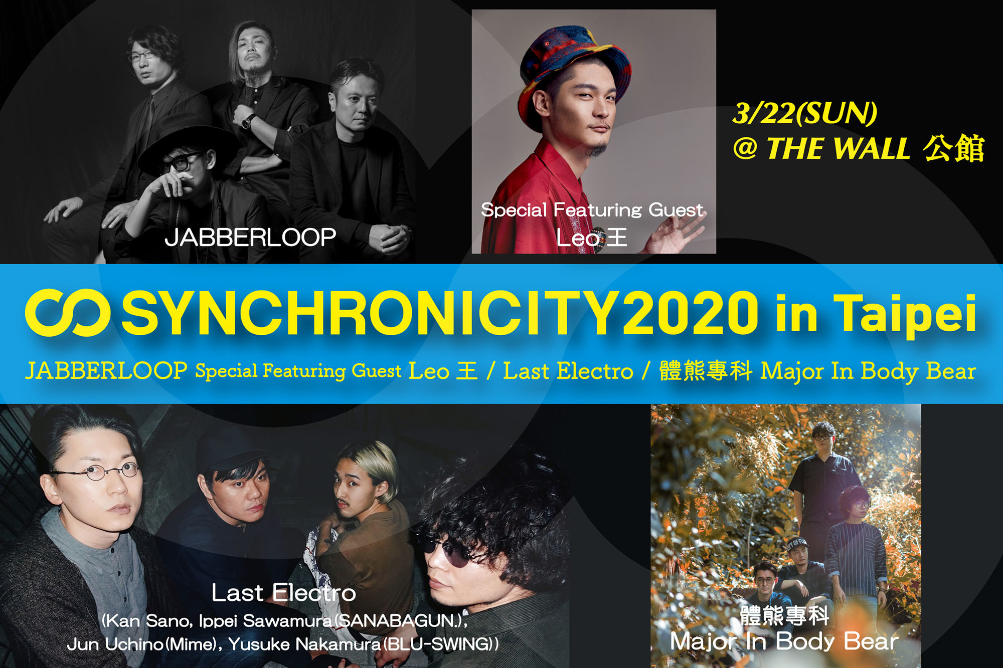また、台湾で初開催となる『SYNCHRONICITY2020 in Taipei』の詳細も発表。台湾では日本からJABBERLOOP、Last Electroに加え、台湾からJABBERLOOPのスペシャル・フィーチャリング・ゲストとして2019年に台湾グラミー賞「金曲奬」で最優秀男性歌手のタイトルを受賞したLeo王、そして台湾のバンド・Major In Body Bear 體熊專科が出演する。