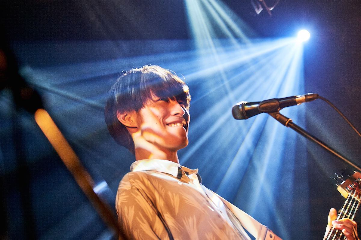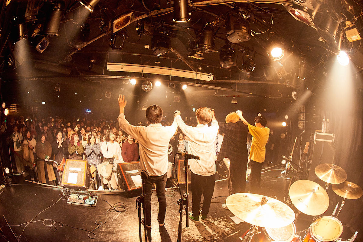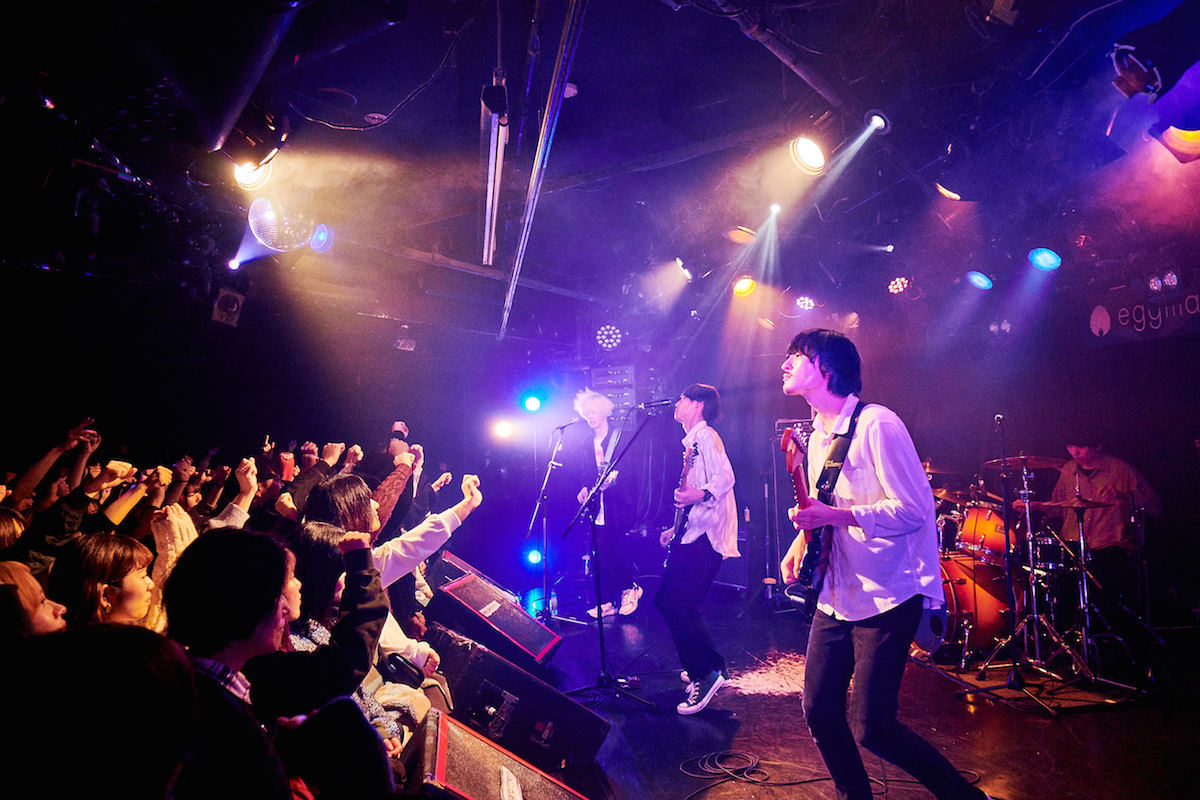 SEが鳴り、メンバーが入場。センターに立つ山口ケンタ(Vo/Ba)が松永祐太朗(Gt)、金廣洸輝(Gt/Cho)、田中優希(Dr)とそれぞれ目を合わせ、頷いたあと、4人が演奏を始めた。1曲目は「セトモノ」。イントロの時点からアンサンブルは前のめりになってドライブしている。上手側・松永のギターによる、舞い落ちる花びらのような軌道を描くメロディ、コード。下手側・金廣のギターから発せられる、人の心を焚きつけるザクザクとしたカッティング。「唄ってくれ!」と山口が投げかけると、オーディエンスが思いっきりシンガロング。山口はそれを見て飛び跳ねながら喜んでいた。
