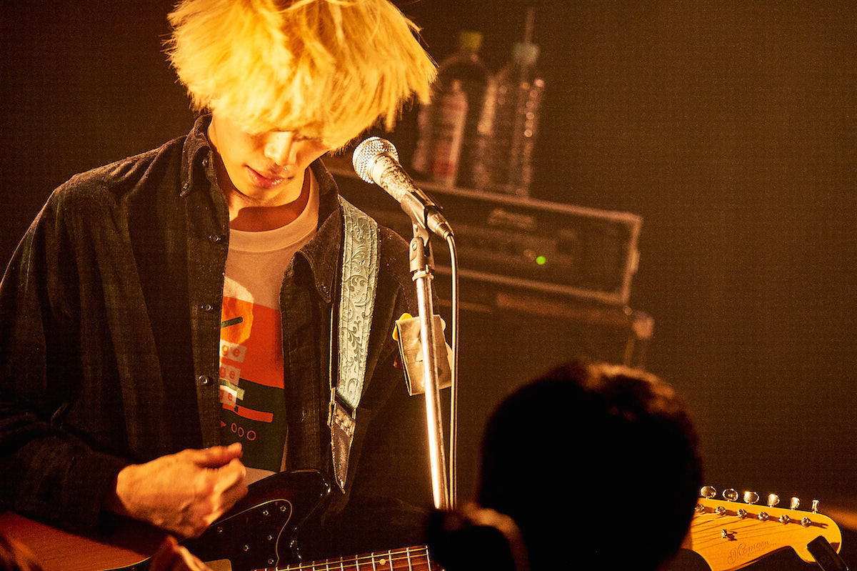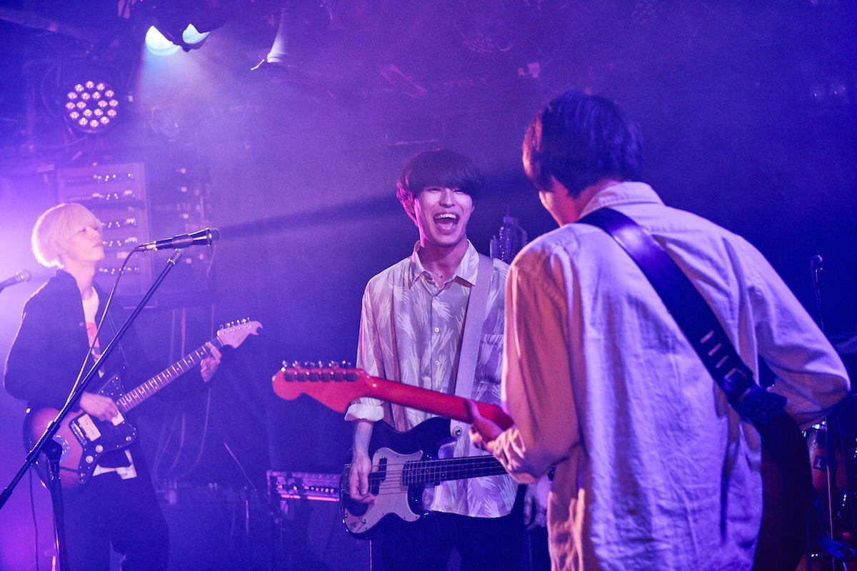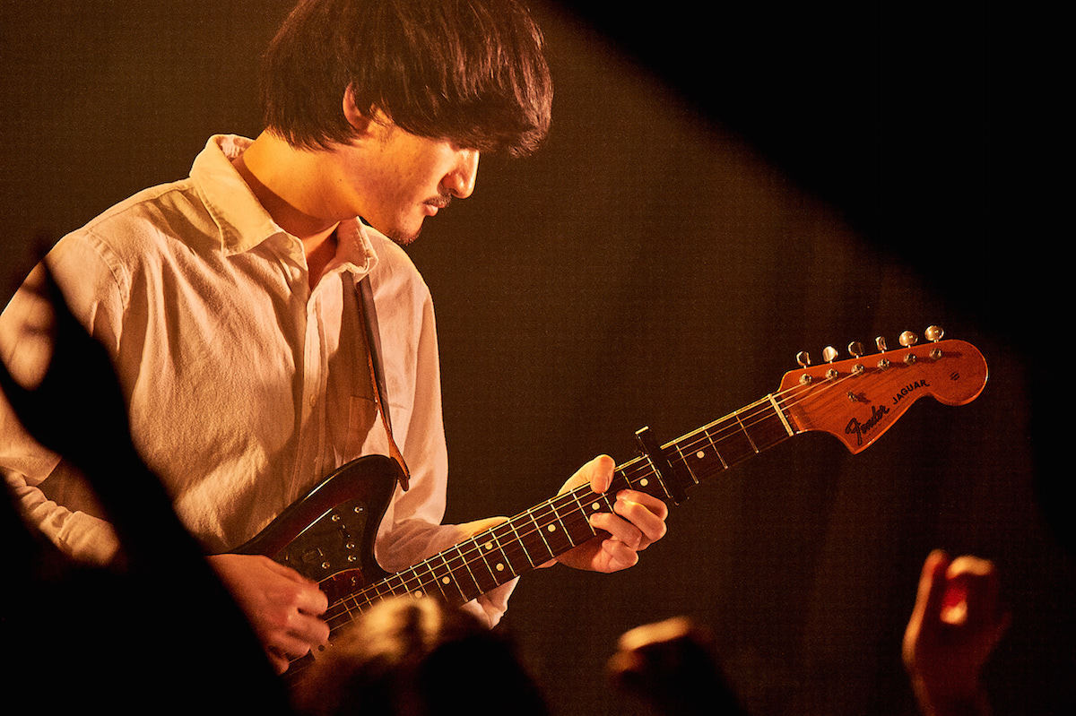 歌とベースから始まる「ginger air」はギター2本のリズムも独特で、ちょっと歪なピースの嵌り具合に何だかうずうずする。ビート自体はシンプルだが不思議と踊れる曲だ。「1954」では、山口に指された田中がフィルインを挟むなど遊び心も覗かせる。そして「海より深い、炎より激しい、僕らにとって大切な曲です。この曲だけはどうかここで聴いてくれ」(山口)と紹介された「スープ」は、間違いなくこの日のハイライトだった。2本のギターの重なりを筆頭に一捻りも二捻りも効いた4ピースサウンドは、純色でも原色でもないが、奥行きを感じさせるその濁りこそがこのバンドの持ち味である。ここまで苦楽を共にした、4人の月日を煮詰めたみたいな音楽が、今ここで鳴っている。ボーカルだけでなくすべての楽器が唄っていて、バンドが共に呼吸している。ラストシーンでは、山口のビブラートがライブハウスの中で綺麗に響いた。