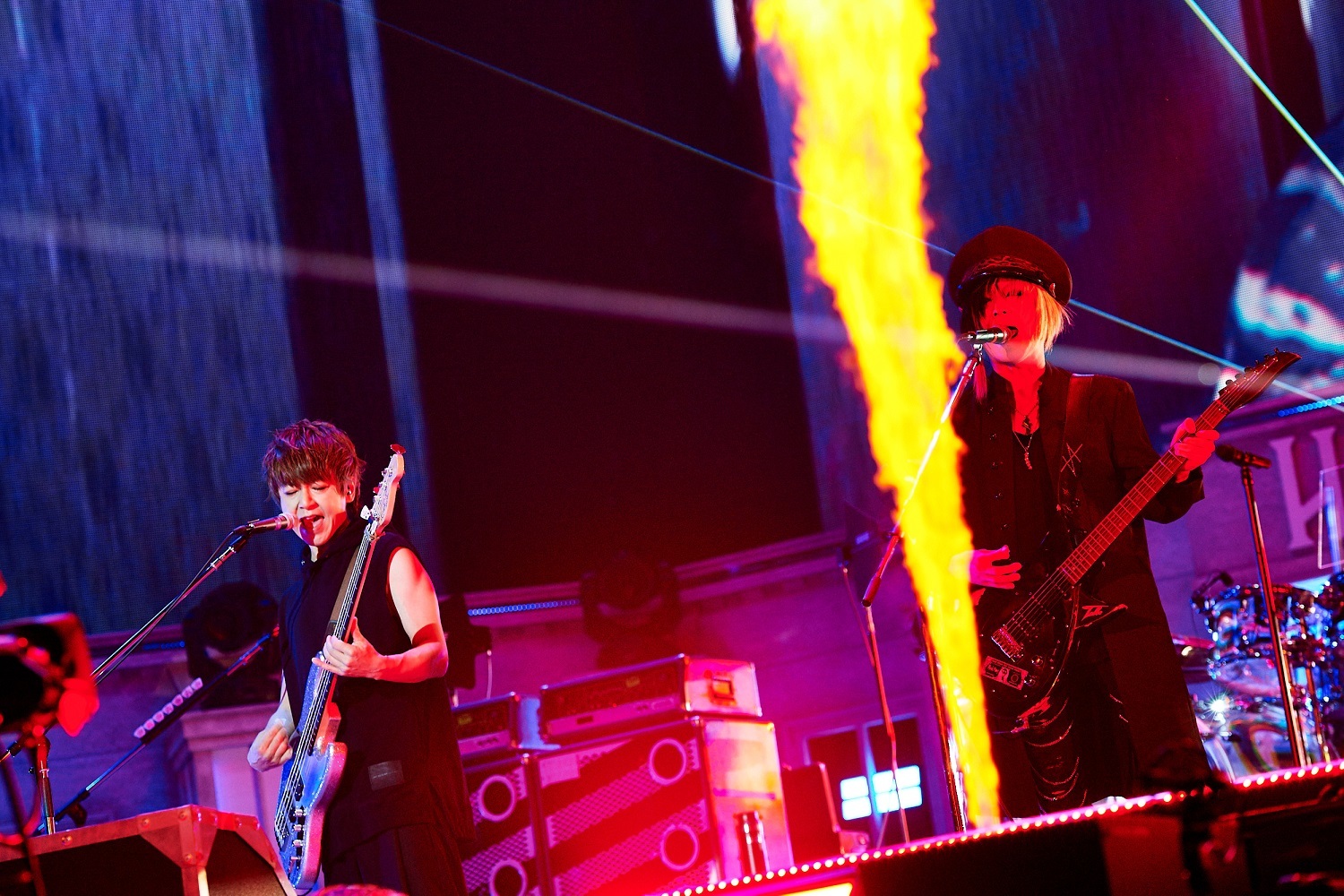 JIROの奏でるベース音にTAKURO、HISAHIと次々と加わっていき、TERUの「AMERICAN INNOVATION!」の掛け声と共にステージ両脇にメンバーを模した巨大バルーンが登場。バルーンのTERUがタオルを左右に靡かせているかと思いきや、本物のTERUがタオルを振り回すなど、「AMERICAN INNOVATION」では会場が一体となって盛り上がった。