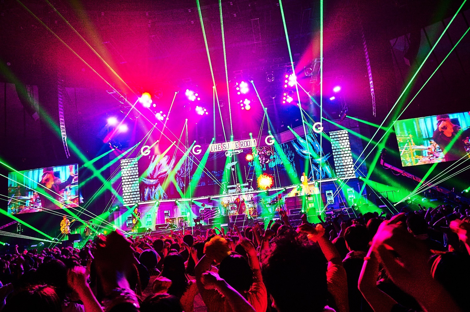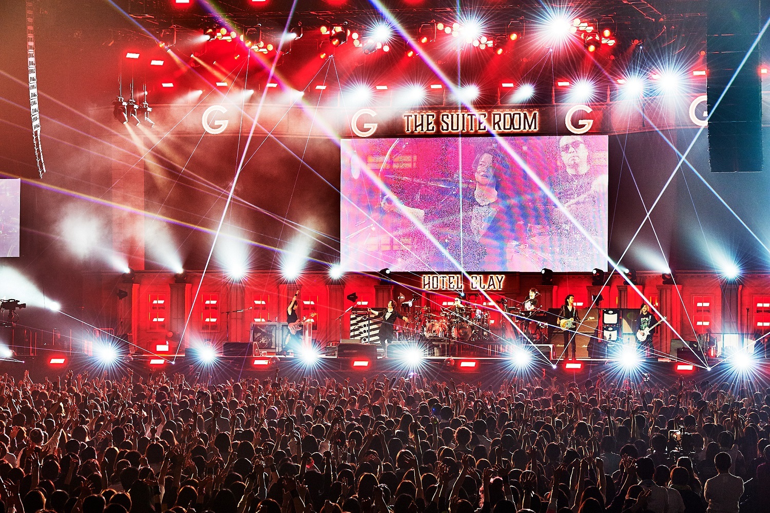 合わせTERUがしっとりと歌うバラードコーナーでは未発表曲「Beautiful like you」を披露した。白いスクリーンに右から左へと歌詞が流れていくシンプルな演出で歌詞を引き立てたのは「つづれ織り~so far and yet so close~」。しっとりとした雰囲気からは打って変わって「口唇」でこれぞGLAYというロックな世界へ引き込むと、『THINK ABOUT MY DAUGHTER』ではフロアに青・赤・黄・緑・そして白の5色の大玉が投げ入れられ、盛り上がりが最高潮に。TERUが白い大玉をステージ下手のスタンド席に向かって投げ入れようとする姿に、座席の場所に関係なく、多くのファンに楽しんでもらいたいという、HOTEL GLAYのホスピタリティを感じた。