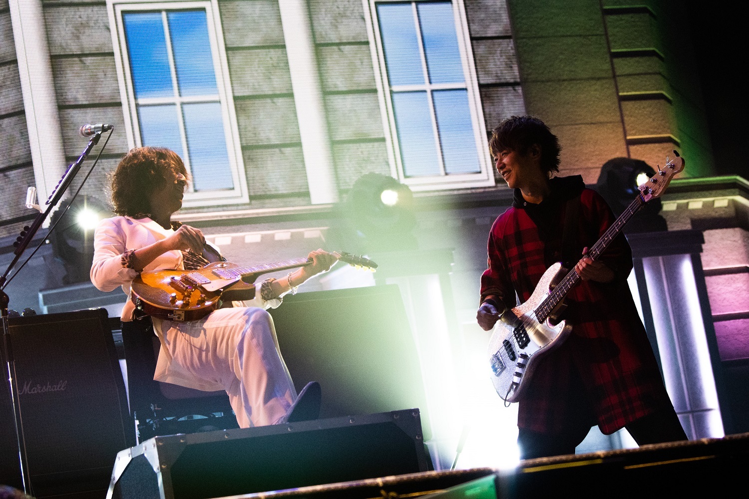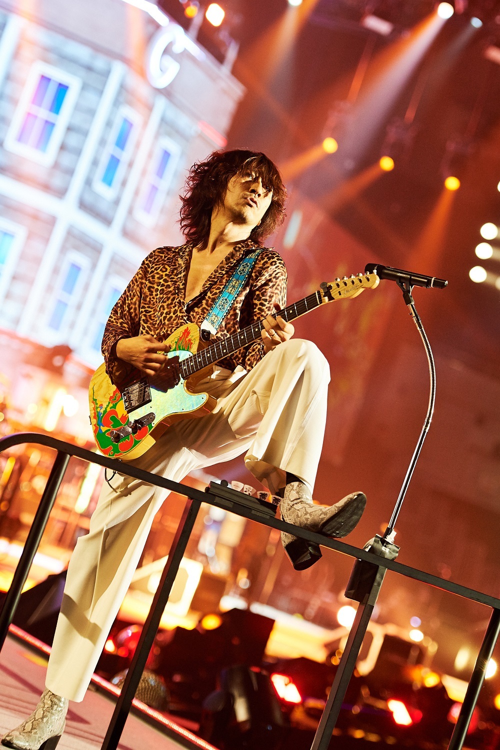 続くMCでTERUは「沢山の愛情と、沢山の皆さんの想いで、こうして広い横浜アリーナというステージに立たせてもらっています。本当にありがとうございます。」と感謝の意を述べる。GLAYの結成当時を振り返りつつ、先に演奏した「Flowers Gone」が1993年に制作され、25年以上演奏し続ける中で生き続けてきた楽曲であることを伝えた。これまでリリースした楽曲も、最近リリースした楽曲も、これから長い時間かけて演奏し続けることで多くの人の想いが詰め込まれ、より味のある楽曲に成長していく。10年後の曲の姿が楽しみだとTERUが語るのは、「戦禍の子」だ。「愛」をテーマにした線画の映像とともに届けられたこの曲には、思わず涙腺が緩んだ。次いでTAKUROのギターが奏でるイントロから始まったのは、TAKUROが贈るラブソング「あなたといきてゆく」。そして青と白のライティングで丁寧に紡がれたのは、TERUが自身父親を思い浮かべながら書いたという父子の絆を歌うミディアムバラード「COLORS」だ。心温まる楽曲を立て続けに披露し、会場中が聴き入った。