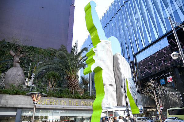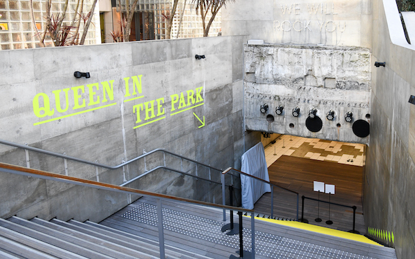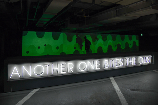 まずは数寄屋橋交差点の一角にある地上部の公園からスタート。公園の中心にはクイーンのボーカル、フレディ・マーキュリーのシルエットをかたどった鏡のオブジェが立ち、その背後には“QUEEN IN THE PARK”のネオンサインが見える。