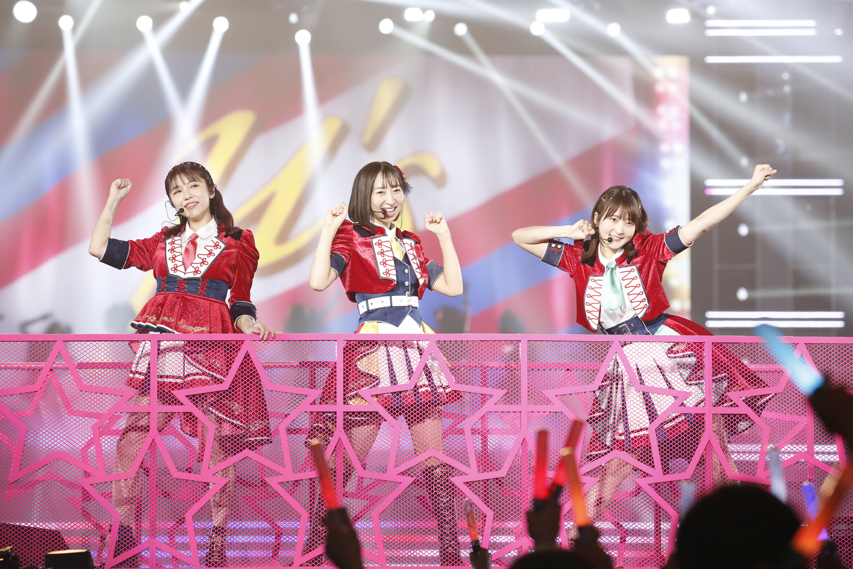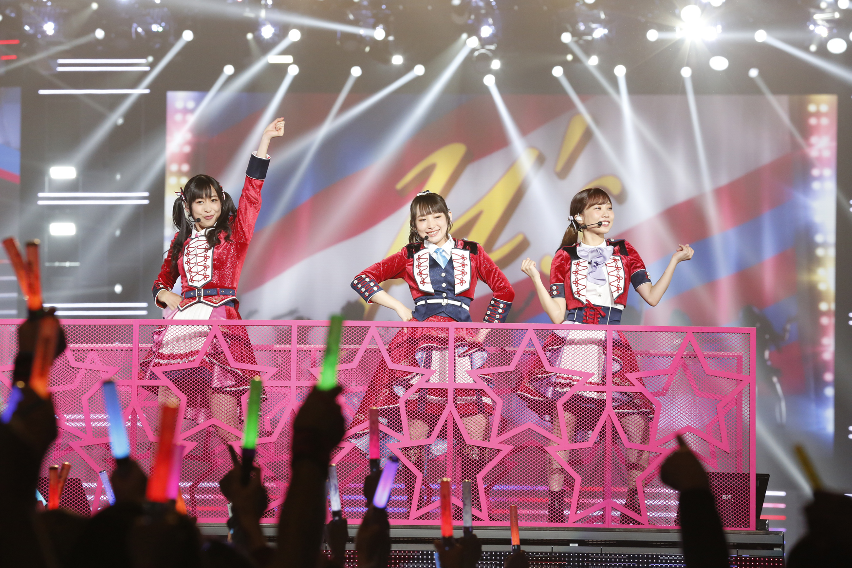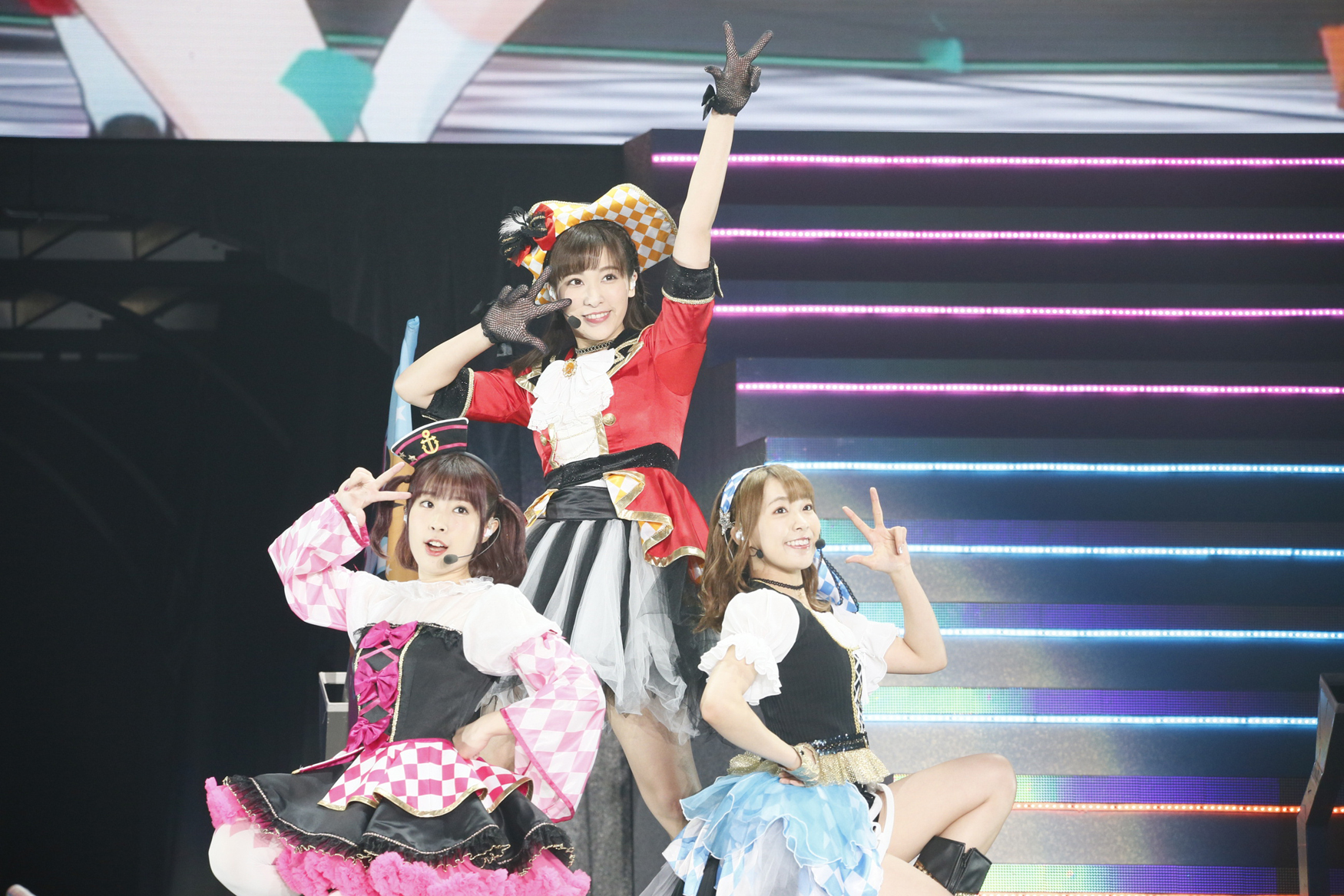 セカンドシングルのジャケットイラストを再現した大航海時代の船乗り風デザインの衣装をまとい、CYaRon!のフラッグを掲げながら登場した3人による一曲目は当然そのナンバーである「近未来ハッピーエンド」。恋する人達への元気な応援歌を間奏でフラッグを振りかざすパフォーマンスなども交えて元気に歌いきると、続いて一転してしっとりとした曲調の「夜空はなんでも知ってるの?」へ。親友とケンカをしてしまった女の子が後悔の想いを抱えて過ごす夜を唄った切ないナンバーを、夜空をイメージしたような青のライティングに染まるステージで披露。間奏では渡辺曜/斉藤朱夏がメインステージでソロのダンスを見事に決め、ラストは3人が一緒にステージに揃い、情感あふれるハーモニーで歌を締めくくった。