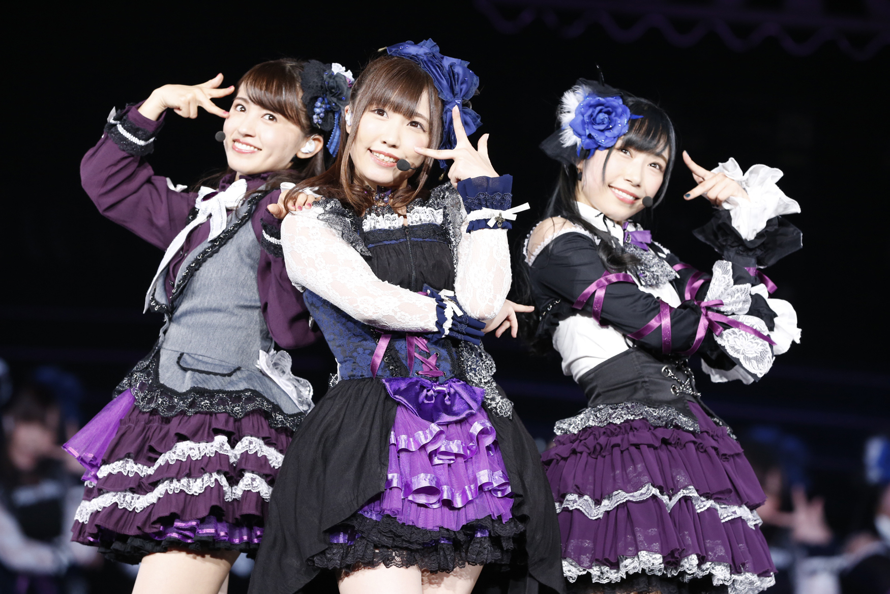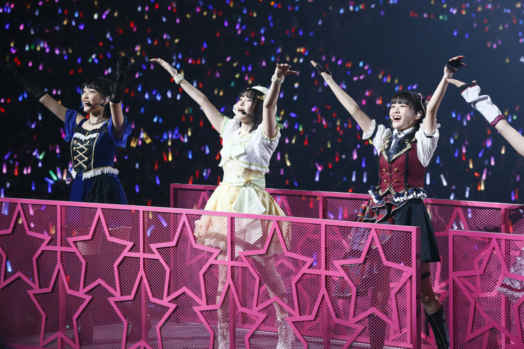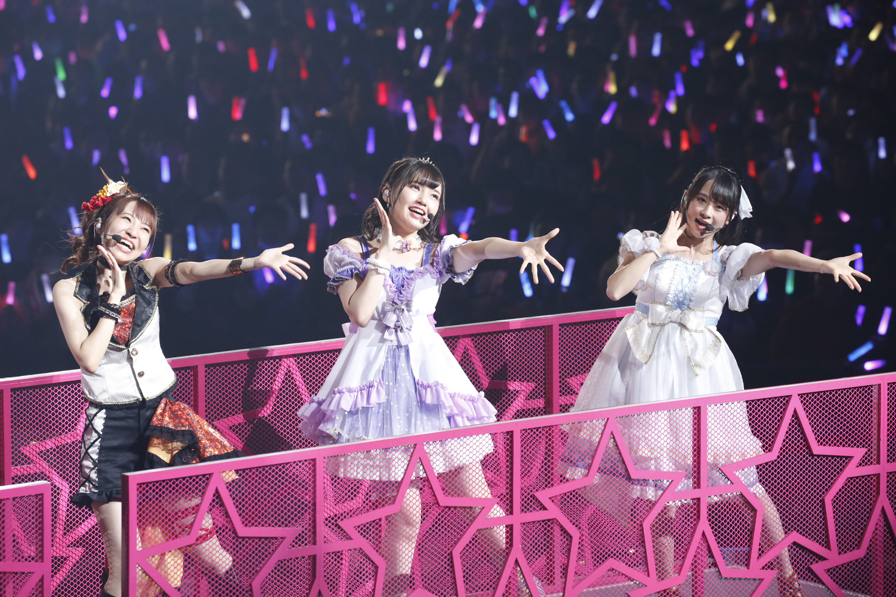セカンドシングルのジャケットイラストを再現した大航海時代の船乗り風デザインの衣装をまとい、CYaRon!のフラッグを掲げながら登場した3人による一曲目は当然そのナンバーである「近未来ハッピーエンド」。恋する人達への元気な応援歌を間奏でフラッグを振りかざすパフォーマンスなども交えて元気に歌いきると、続いて一転してしっとりとした曲調の「夜空はなんでも知ってるの?」へ。親友とケンカをしてしまった女の子が後悔の想いを抱えて過ごす夜を唄った切ないナンバーを、夜空をイメージしたような青のライティングに染まるステージで披露。間奏では渡辺曜/斉藤朱夏がメインステージでソロのダンスを見事に決め、ラストは3人が一緒にステージに揃い、情感あふれるハーモニーで歌を締めくくった。