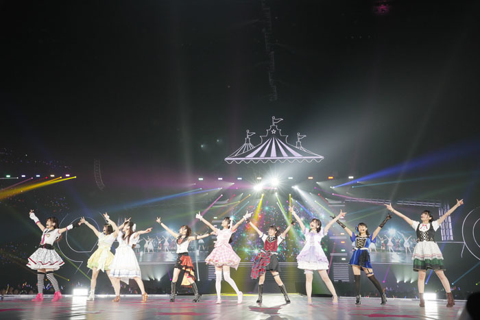 メンバー全員のイメージカラーのライティングとコンサートライトで場内が虹色に染まる中、8人は3台のトロッコに乗り込んでアリーナを周回しながらスタンドのファンの間近へ。