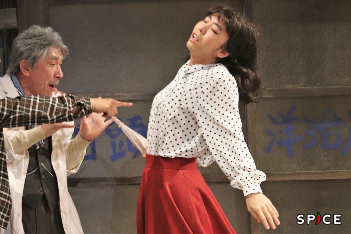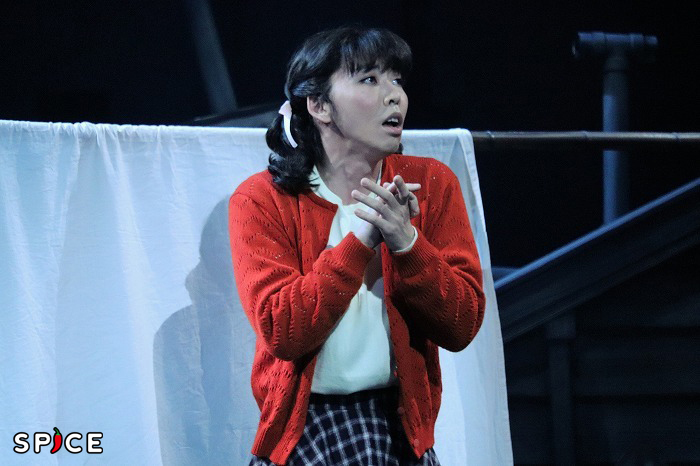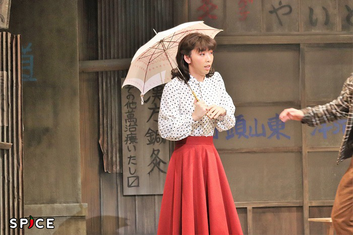 段田としては柄本の女装姿には驚きを隠すことができず、「そのうち竹内まりやさんに見えてきた」と爆弾発言。その言葉を受けて柄本はその場で竹内まりや風に振り返り、一同大笑い。「竹内まりやさんに失礼があったら謝ります」と段田がニヤリと楽しんでいた。「でも男が女役をやっていることを忘れてしまうんです。美男美女がやるのではなくこっちのほうが『ロミジュリ』をやる本質が出ますね」と見どころを語っていた。