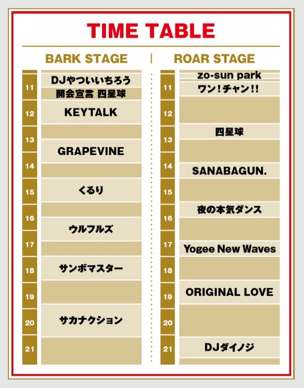 今回公開されたタイムテーブルによると、オープニングDJやついいちろう~KEYTALK~四星球と、怒涛の“ロック祭り”でスタートを切る。そして、「ROAR STAGE」のトリを『ビクターロック祭り』初出演のORIGINAL LOVEが、そして「BARK STAGE」のトリはサカナクションが務める。