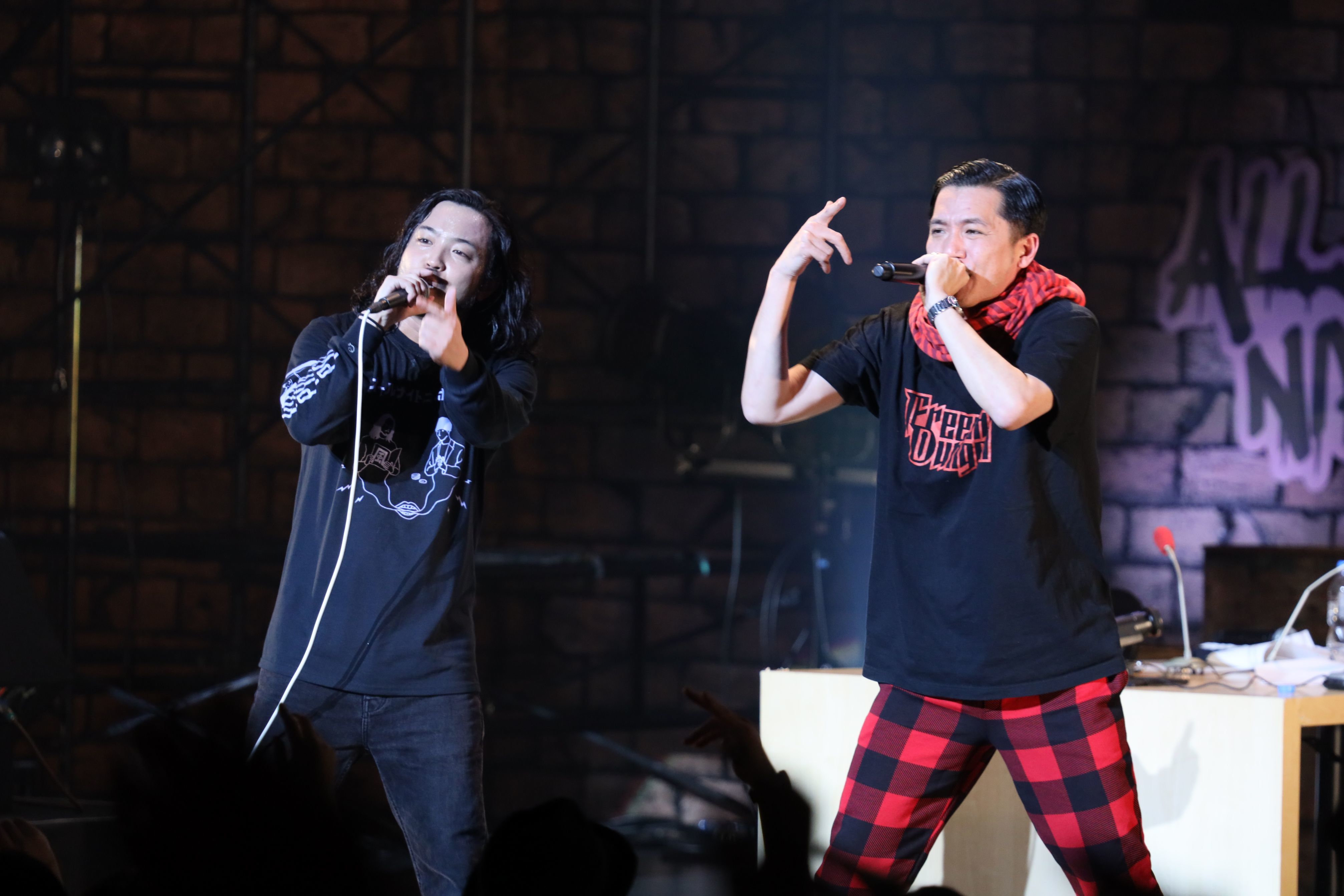 ひとしきり会場を盛り上げた後は、番組コーナーのHIPHOPニュースへ。「ビリー・アイリッシュが最近のラッパーは嘘つきだ」と発言したことに、DJ松永がR-指定に「実際リアルじゃないの?」と問うと、「ホンマに悪いことばっかやってるやつは音楽せえへんやん」と一言。なぜかR-指定が客席とライブビューイングで見ているリスナーに対して「最後まで嘘つかずに真実の言葉のみでやり遂げます」と宣言する流れに。