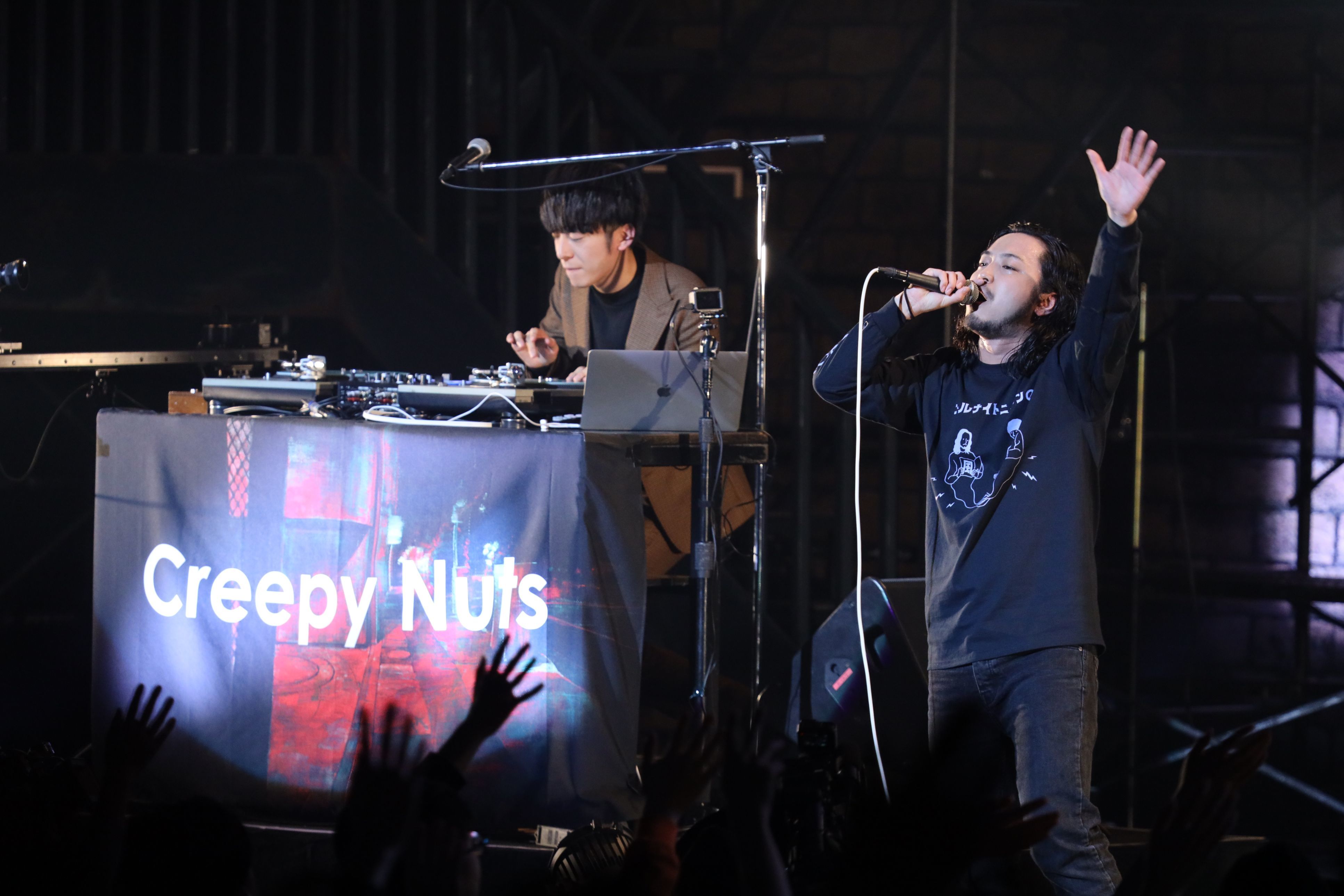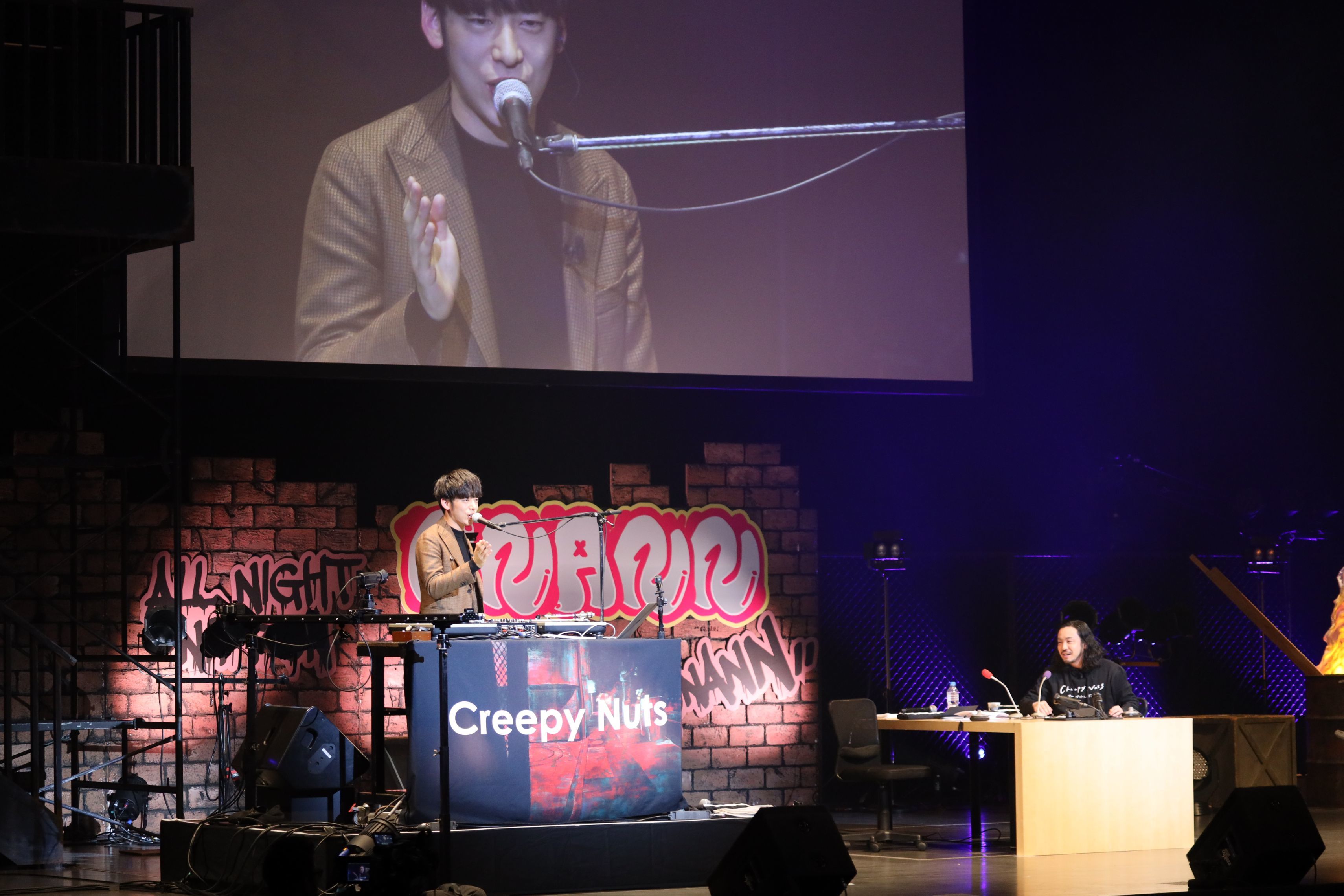 歌い終わって3人でのトークの後、 会場の興奮も冷めやらぬ間にCreepy Nutsのライブがスタート。「手練手管」「助演男優賞」「紙様」「合法的トビ方ノススメ」「阿婆擦れ」の5曲をつづけて披露。「ホールもいいね」と満足げな様子を見せた後、『オードリーのオールナイトニッポン10周年全国ツアー』のために書き下ろした「よふかしのうた」を歌いあげた。ラストは再度、ゲストのZeebraを呼び込み、2組で「Street Dreams」を熱唱。「こんなに優しいレジェンドはいないです」「ありがとうございます」と感謝の気持ちを述べる2人に対し、Zeebraは「一生手がかかる後輩です。声かけていただければまた来ます」と即答。帰り際には番組で2人がイジり倒したZeebraが迷?パンチライン「テキーラの瓶みたいな感じで超ビンビン」を放ち、リスナーから大きな歓声が上がった。
