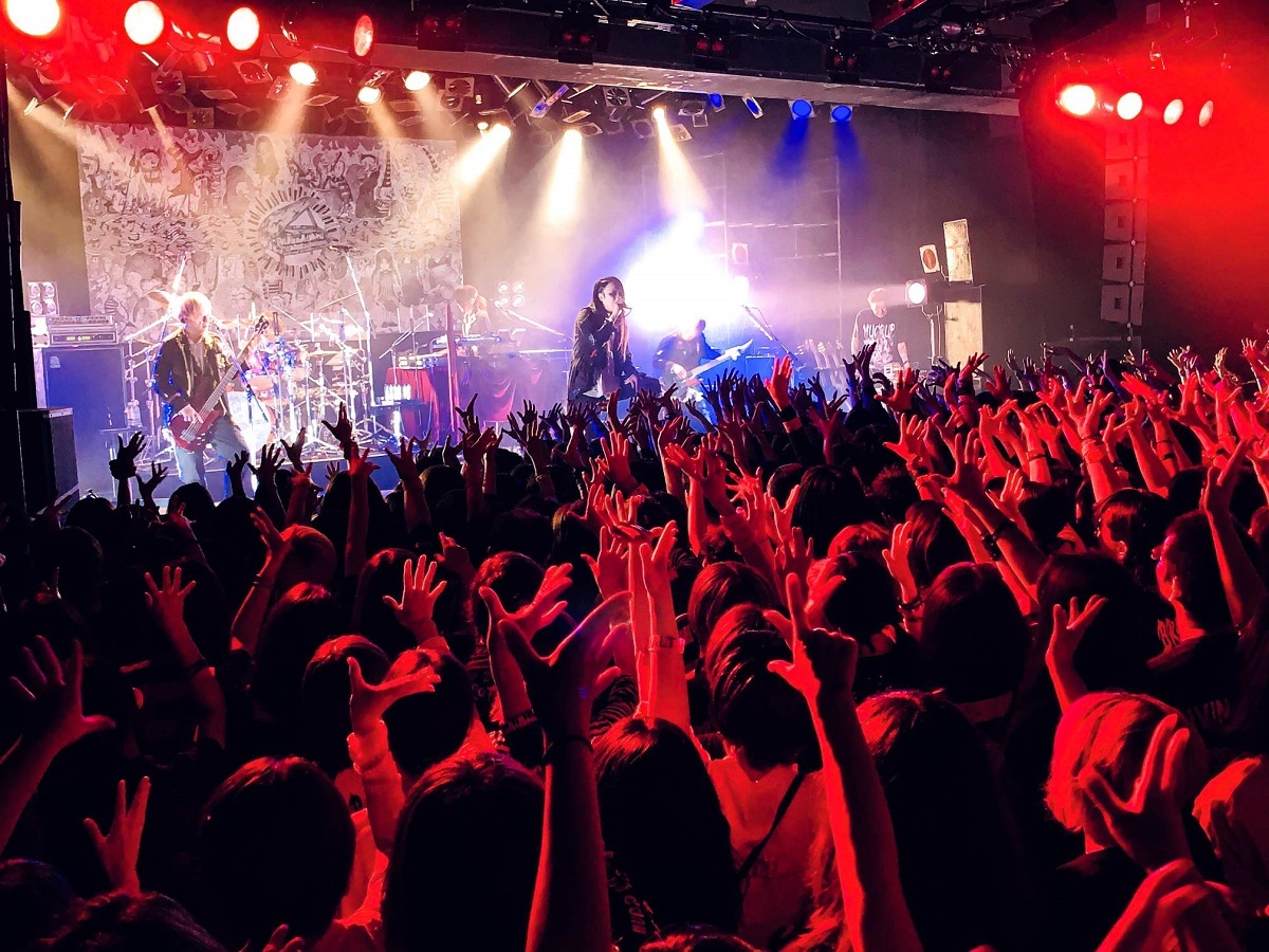 中盤では「悲観主義者が笑う」や「死して塊」の重苦しいムードから一転、「1979」でYUKKE(Bs)はアップライトベースに持ち替え、跳ねる様にジャジーなリズムから楽曲はスタートする。ホームセクションを含む新たなアレンジも施され、メンバー全員それぞれのソロパートを織り込む展開に大歓声が上がる。続く、「積想」「COBALT」では最新型のMUCCが披露されてゆく。大胆に鍵盤の旋律を織り交ぜ、メロディアスに仕上げられたこれらの楽曲は、今のMUCCの楽曲構築力の高さを伺わせるには十分と言えた。