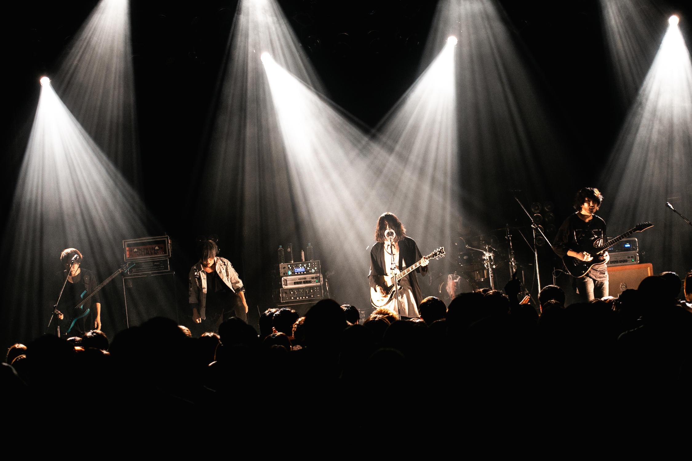 「ジェンガ」「夕立ち」で心の中にかかえるものを吐き出すように歌う京寺(Vo)。「今この空間に、好みが違い、好きになる傾向が違う人がいる。それはすごくいいこと。どれだけ感じるものが違ったとしても、人間の根底的な部分は変わらない。みんな、死に物狂いの一歩を踏み出して生きている」というMCのあと、披露される「偽物の宴」。<下手に目を付けられず生きるには 人としての華やかさは邪魔だ>と、シリアスな詩がどっと押し寄せてくる。そんななかでオオサワレイ(Gt)は時に大きなアクションを交えながら、一方で森田康介(Ba)は職人的に、それぞれ音を刻んでいく。