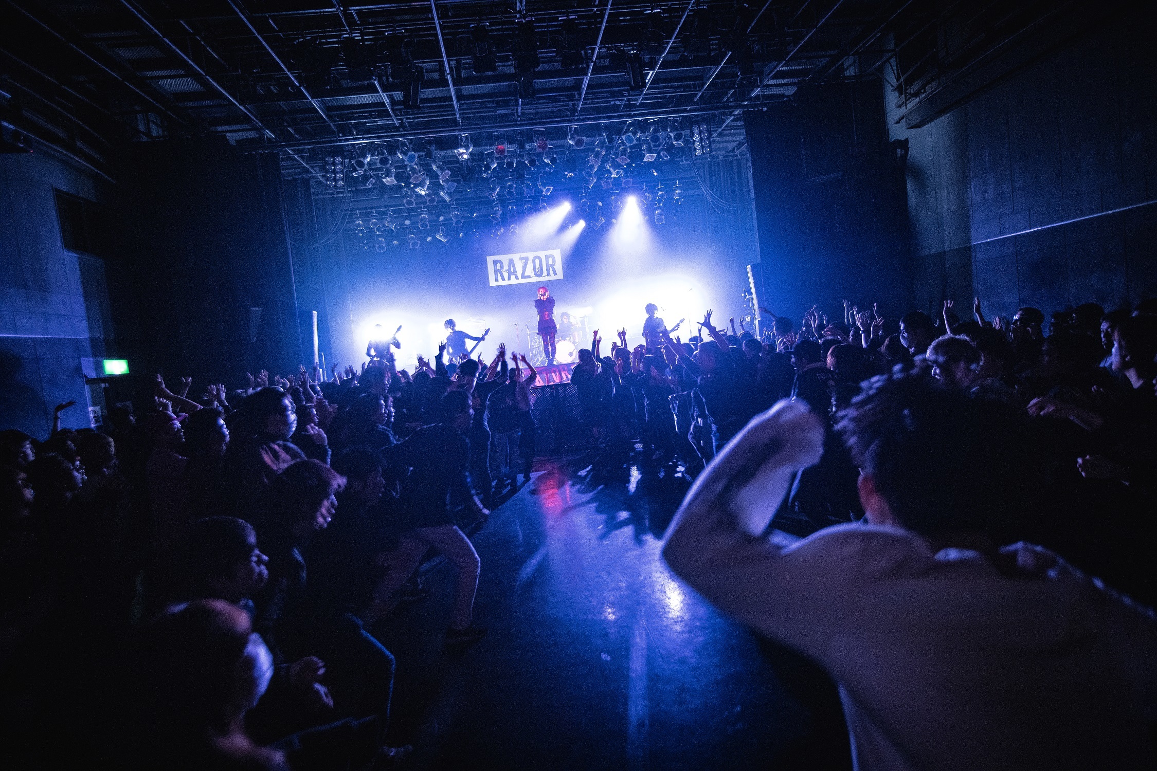 2番手は、RAZOR。1曲目「LIQUID VAIN」でいきなり発生する無数のヘドバン。そう、これがRAZORのフロアの見どころの一つ。昔からヘドバンは歌舞伎の気振りに例えられてきたが、彼らのライブでは、波しぶきがあちこちで群発しているように見える。さらに客席をヒートアップさせるのは、フロントマンの猟牙(Vo)の存在感。狂気じみていながらもフォトジェニックな容姿と動作は、さながら映画『JOKER』の主人公・アーサーのよう。