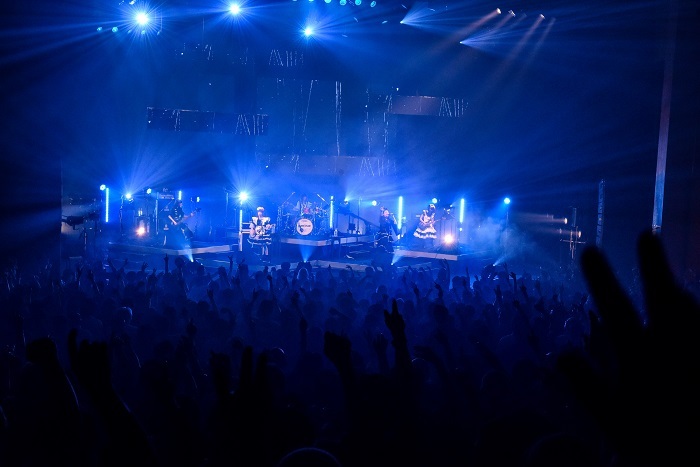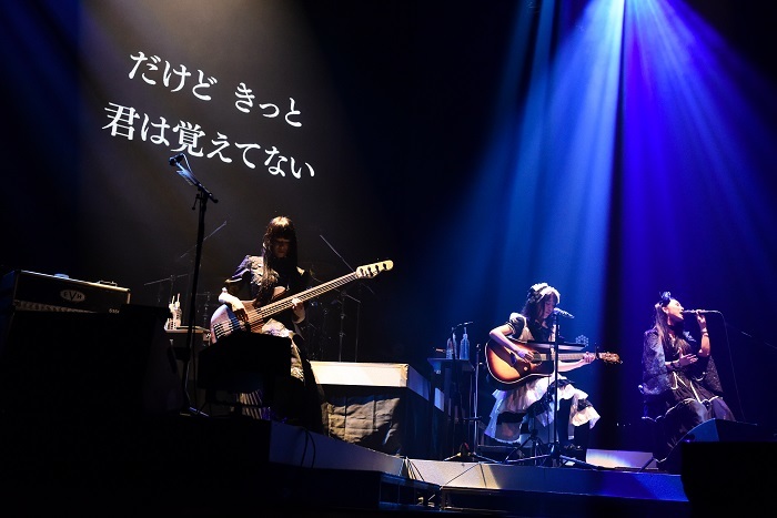 さらに、MISA(Ba.)を呼び込み、もう1曲、アコースティックで「Puzzle」を披露した。先日、Music Videoが公開されたばかりの「The Dragon Cries」の際には、再び紗幕が下ろされ、ドラゴンの炎をイメージした映像を投影し、楽曲の世界観を表現した。