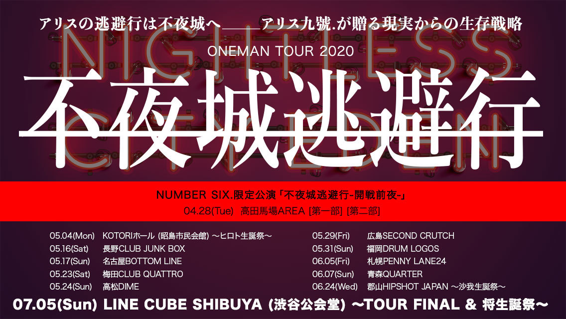 また、同アルバムを携えた全国ツアー『アリス九號. ONEMAN TOUR 2020「不夜城逃避行」』の開催も決定。アルバム先行視聴形式の壮行会ライブとして、4月28日に高田馬場AREAでファンクラブ限定公演が行われ、その後5月4日のKOTORIホール(昭島市民会館)を皮切りに、7月5日のLINE CUBE SHIBUYA(渋谷公会堂)まで、全国11ヶ所を巡る。チケットは、本日2月16日よりファンクラブ先行がスタートしている。