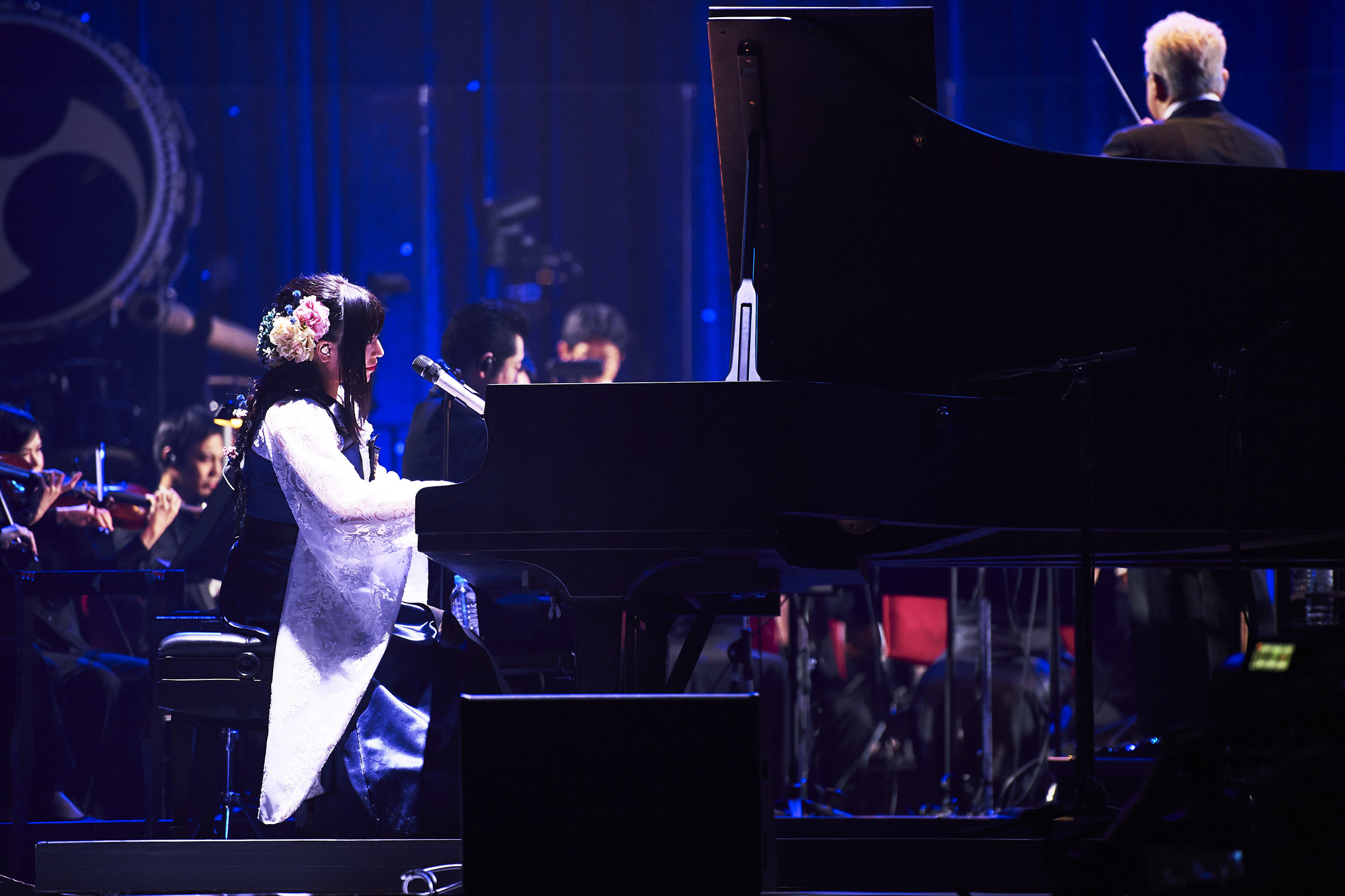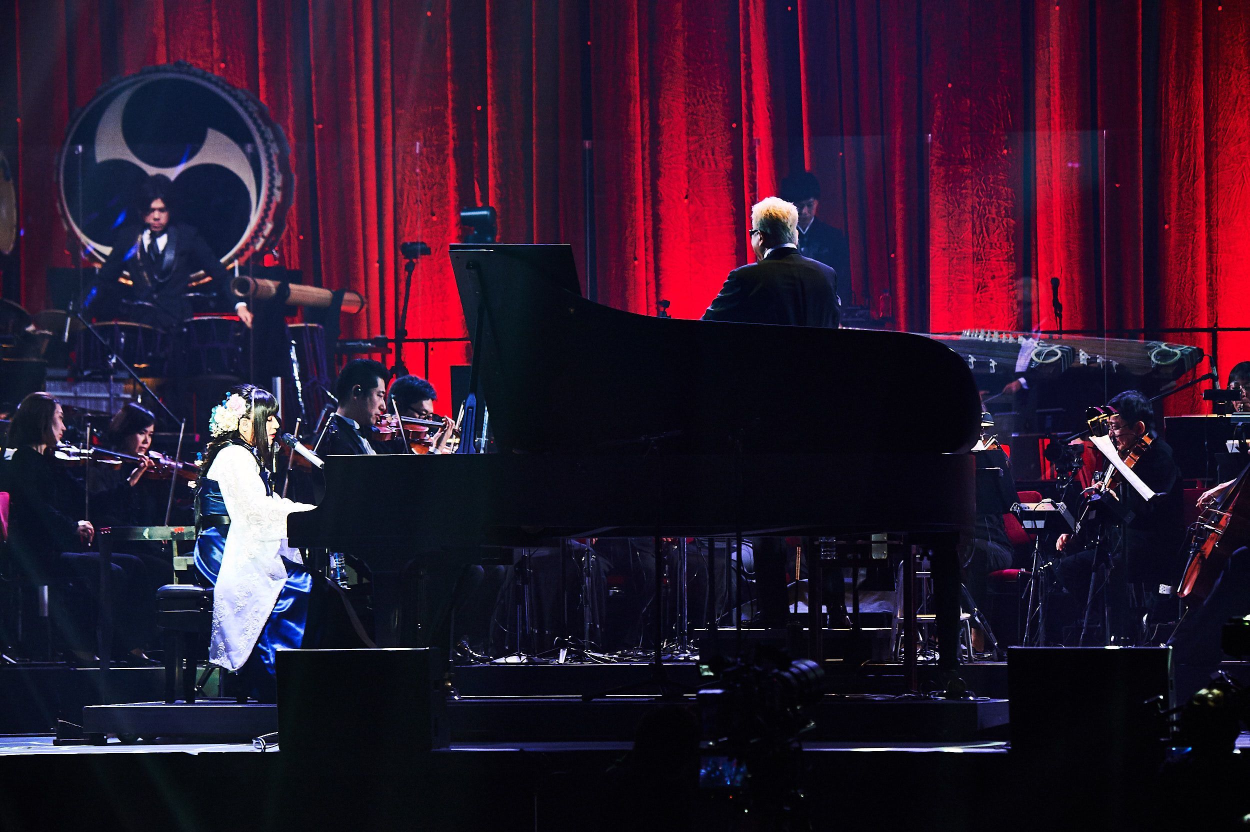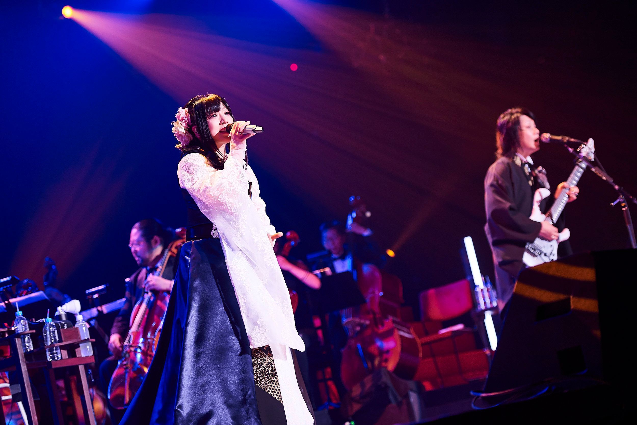 ライブはオーケストラの面々と鈴華ゆう子(Vo)のピアノによる「Overture」からスタート。曲中で和楽器バンドの面々が徐々に加わっていくと、そのまま「オキノタユウ」で豪華なコラボステージへと突入する。メンバーが新調した黒いスーツ調の衣装に身を包む中、鈴華のみロイヤルブルーと白をベースにした衣装で華やかさを演出。どの曲でも原曲以上の優雅さ、壮大さが増大し、その迫力で観る者を圧倒させた。