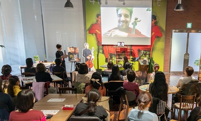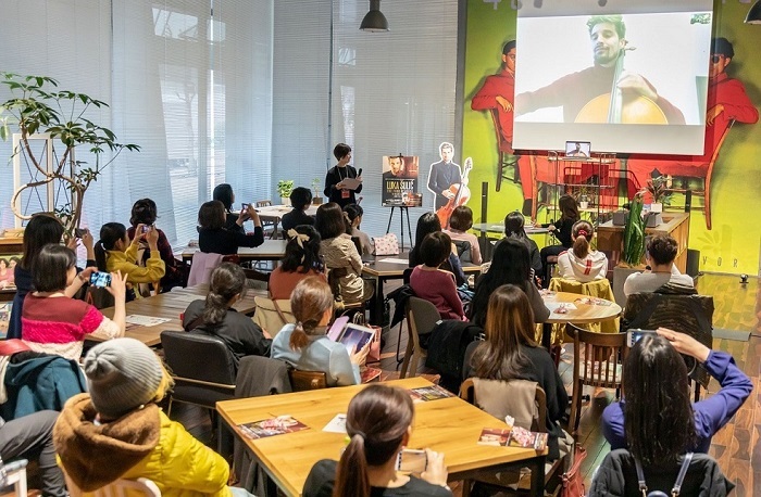 ヨーロッパにいるルカがファンからの質問にスカイプで答える本イベントに全国から30名が参加、3月のソロ来日公演の聞きどころや、昨秋リリースした初のソロ・アルバム『ヴィヴァルディ:四季』の制作秘話等、ルカがリアルタイムで時にチェロを奏でながら熱心に語る一語一句に参加者たちが耳を傾け、その様子はインスタライブでも中継された。