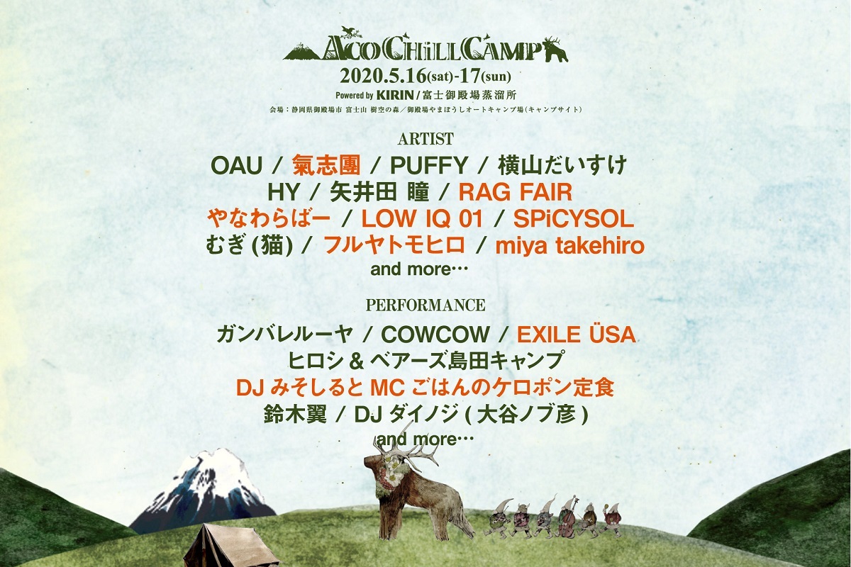 5月16日(土)、5月17日(日)に静岡県御殿場市「富士山樹空の森」で開催される『ACO CHiLL CAMP 2020 powered by KIRIN/富士御殿場蒸溜所 ~アソブ、オドロク、フジサン、キャンプ。~』の出演者第三弾が発表された。