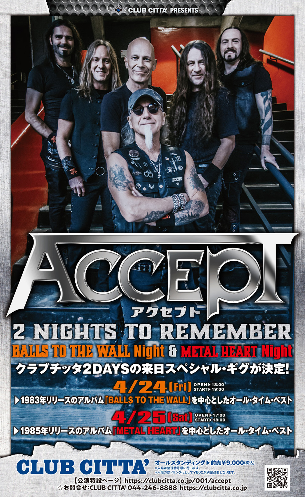 ジャーマン・メタルの魁アクセプトが、4月24日(金)25日(土)CLUB CITTA’にて来日スペシャルギグの開催することが決定した。DAY1の4月24日(金)は1983年リリースのアルバム『BALLS TO THE WALL』、DAY2の4月25日(土)は1985年リリースのアルバム『METAL HEART』を中心としたオールタイムベストとなる事も発表されている。