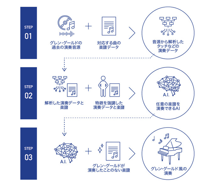 「まずはグールドが実際に残した100時間もの録音を、楽譜と照らし合わせながら、解析をするという作業からスタートします。グールドは、ある特定のパターンのときに、どういった表現技法をおこなっていたのかを、AIにディープラーニング(複雑な判断ができるようになる深層学習)をさせるのです。グールドといえば、やはりあのユニークな表現です。独特なテンポ設定など、楽譜に書かれた情報からは極端に逸脱する表現がありました。そうした彼の独自性、つまり譜面にないところをいかに取り出していくかが重要になります。
