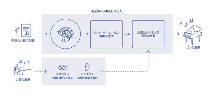 「この『Dear Glenn』というAIは、グールドの行なっていた表現技法をアーカイヴしているので、楽譜データを読み込ませれば、どんな曲でも初見でグールド風に演奏します。ですから、グールド自身が録音を残さなかった曲や、当時は存在しなかった新しい曲も、グールドだったらこう弾いたのではないか、という演奏で聴くことができるのです。アンサンブルもけっしてカラオケ状態ではありません。マイクとカメラを活用し得られた情報、つまり、共演者の様子を『見たり』『聴いたり』しながら、テンポや強弱を操作して音楽作りをします」