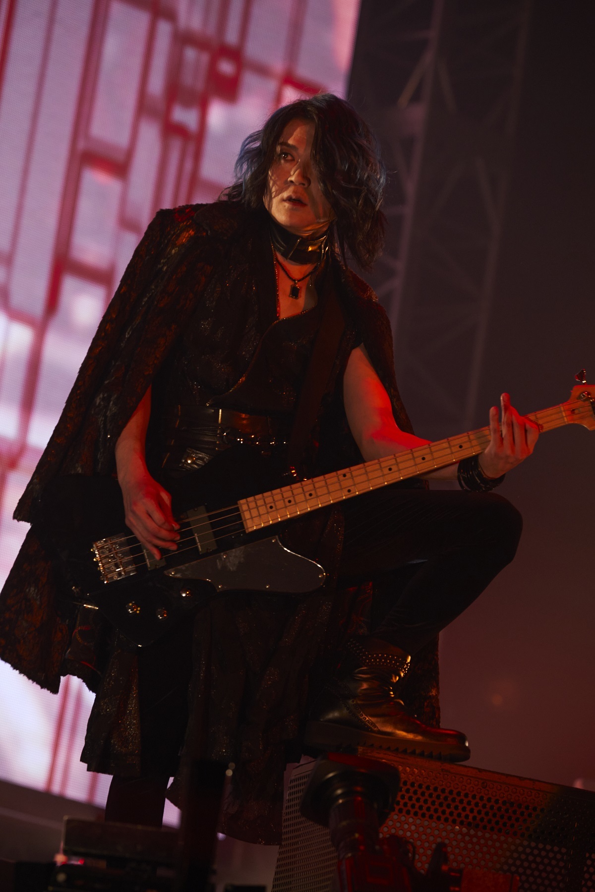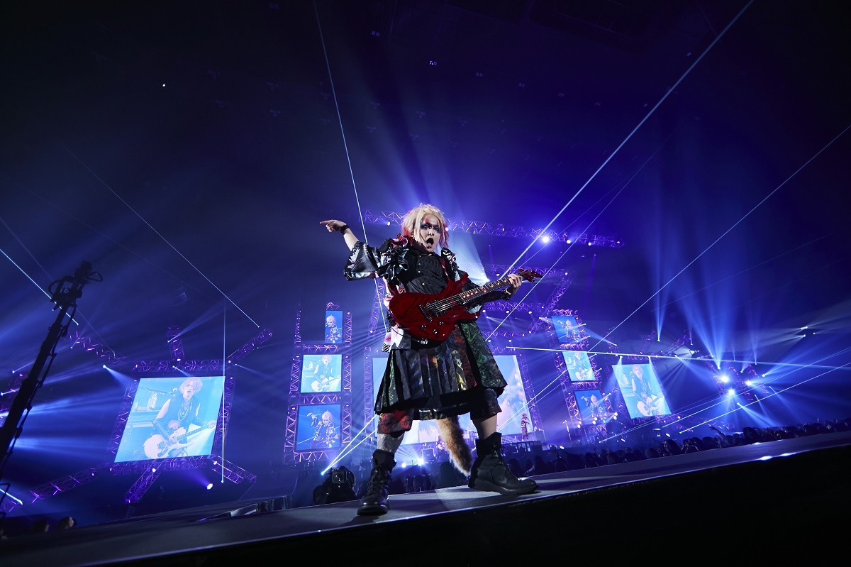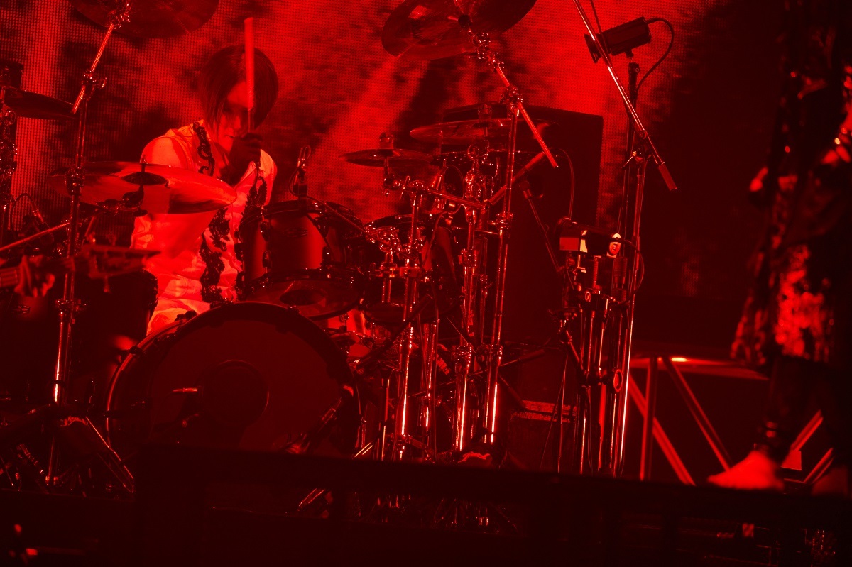 「dogma」のメンバーコールで肩慣らしをしたあとは、「3年ぶりに飛ばしていくぞー! かかってこい!」とYOMIが叫び、RUKAのカウントから「DIRTY」が始まると会場内が絶叫。この曲は、テンポチェンジを繰り返しながらも優れた歌ものとしての整合感に改めて感動。重量感たっぷりの「mimic」は咲人、柩、Ni~yaがアスリートのようにステージ、花道、スロープを大移動するたびに大歓声を巻き起こし、そのままノンストップで「ジャイアニズム究」、炎が吹き上がるなかRUKAの高速ドラムが客席にヘッドバンギングを巻き起こす「ジャイアニズム天」を畳み掛け、センター&スタンド席を狂気の熱狂へと導いていく。