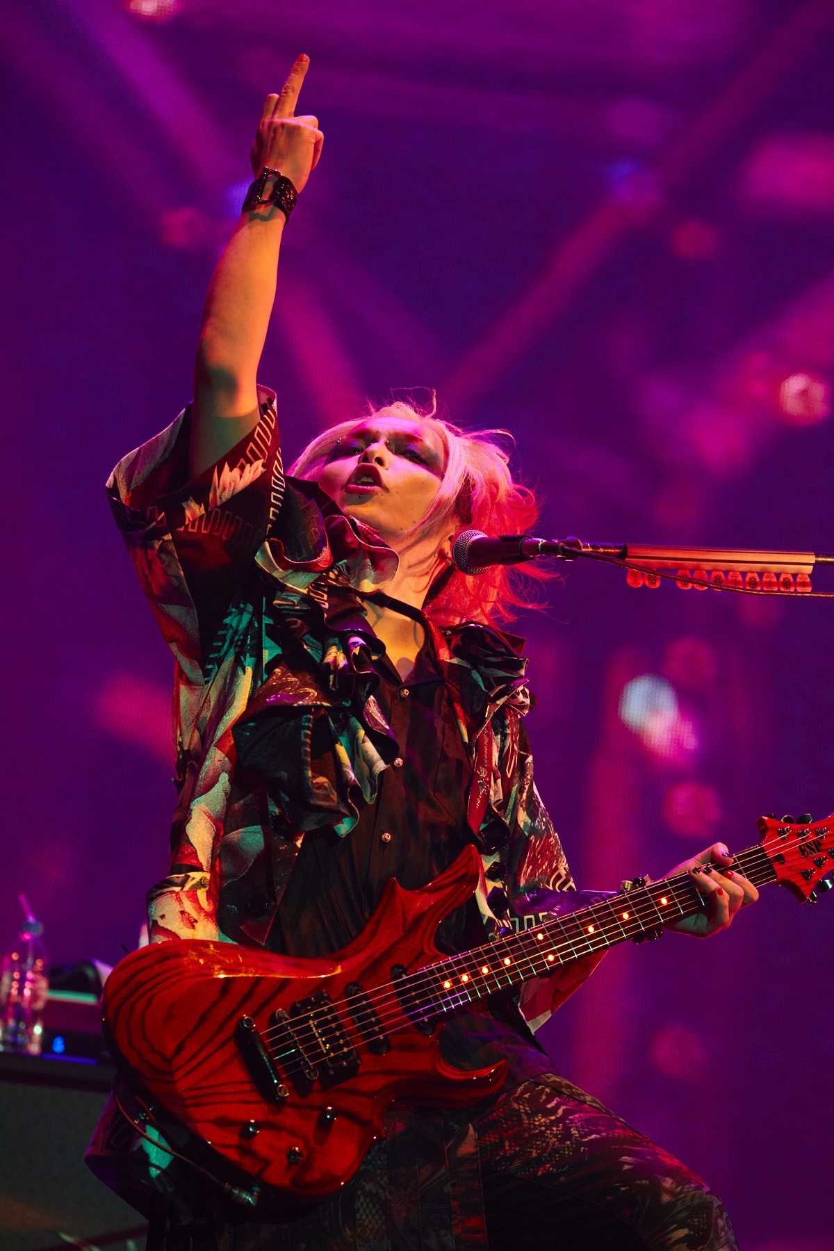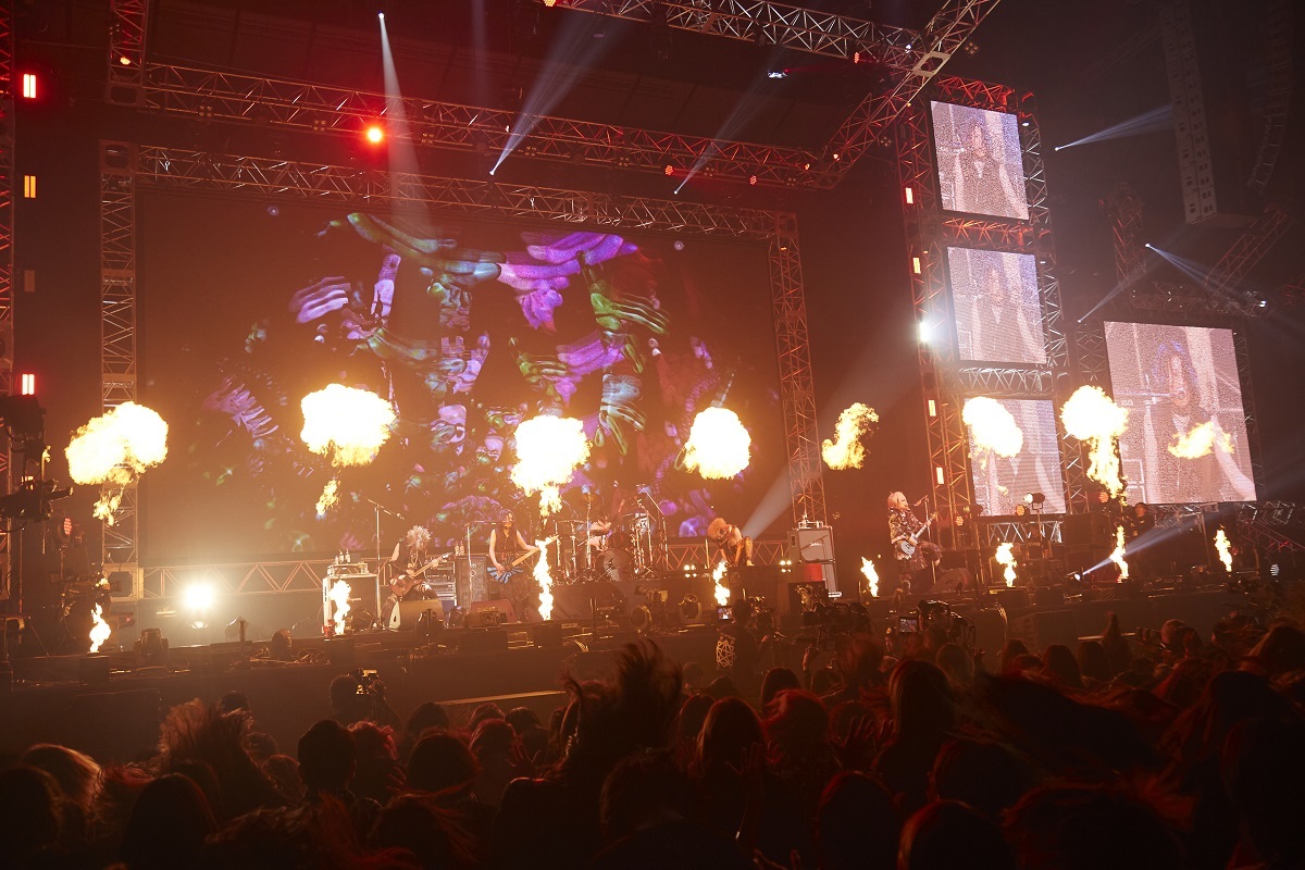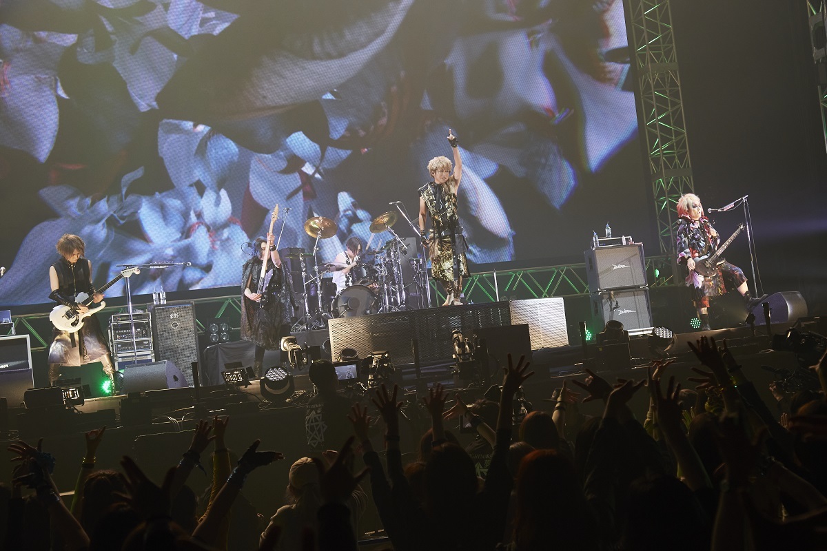 そんな空気をビシッと引き締めるように、続けてNi~yaのベースが観客を沸かせる天下無敵のキラーチューン「HATE」を大量のレーザービームとともにドロップ。このあと、YOMIがバンドとして20周年を迎えられたことについて、観客に感謝の気持ちを伝え「20周年、ここから新しい夢に向かっていきたいと思います」と宣言し、ライブはいよいよ終盤戦へと突入。