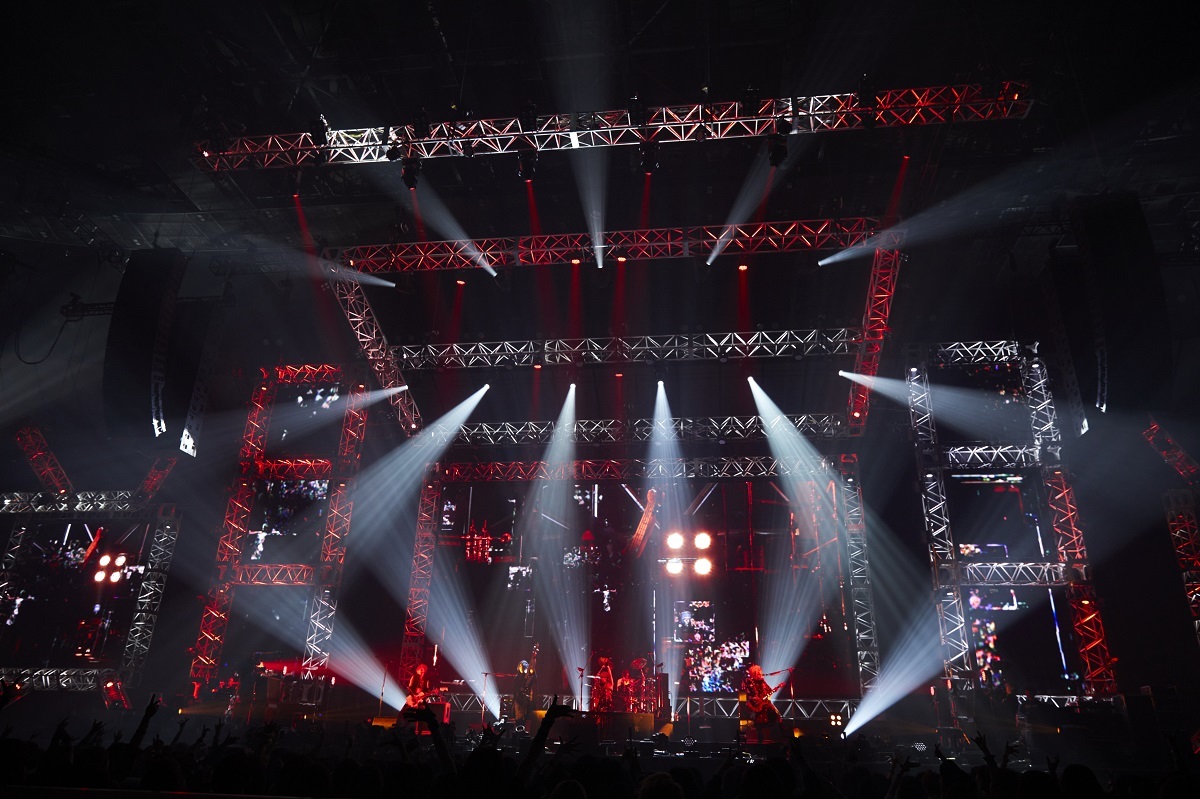 バンド史上初、過去最大級のキャパとなるとなる今回の会場、横浜アリーナ。場内に入ると、センターエリアを横向きに設営するというイレギュラーな仕様で作られた巨大ステージが目の前に広がる。さらに、その舞台からセンター席のちょうど真ん中あたりをぐるりと1周できる花道や、1階席までつながった長いスロープまでが用意されている。過去に、さいたまスーパーアリーナや日本武道館でも1度も見たことがないステージの作りから、NIGHTMARE復活にかけるスタッフたちの並々ならぬ熱い想いが伝わってくる。