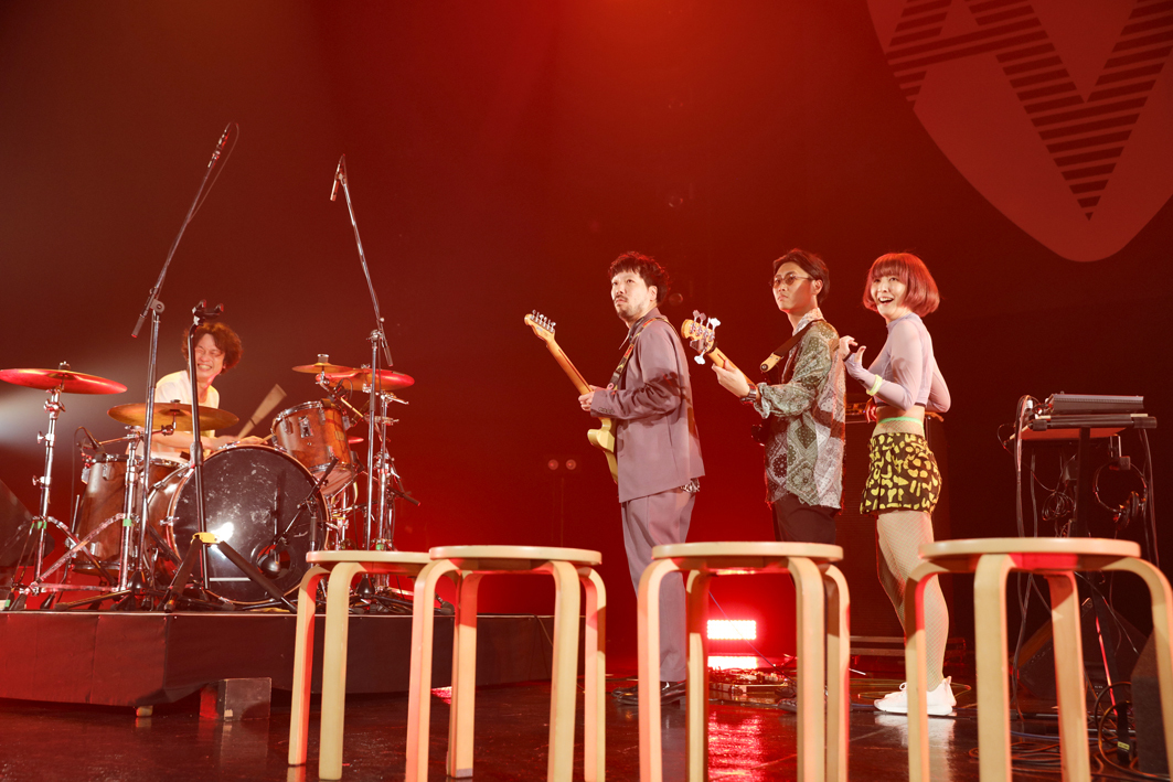 19時ちょうど。暗転したステージに4人が登場。ひとりは身体につけられた電飾ライトを点滅させている。照明が明るくなると、ニガミ17才のメンバーが丸椅子の上に並んで立っている。その場でボーカルの岩下優介に紹介されたメンバーがアルバム「ニガミ17才 a」収録の「A」の演奏を始め、丸椅子を降りて所定の位置に移動。通常、バンドでのドラム位置は後方だが、彼らはステージの左手で真横にセットされている。メンバー全員が各々のポジションに着くと「ライブハウスへようこそ!」のMCでスタート。なんとも奇天烈なオープンニング、呆然と見守る観客をよそに、「おいしい水」、「ただし、BGM」を立て続けに演奏。早口でマシンガンのように発信される歌詞に、ドラムとベースがゴリゴリと絡んでいく。そのグルーヴにオーディエンスも引き込まれ、気がつけば身体がリズムに反応。「ねこ子」ではキーボードの平沢あくびがティッシュケースを持って例の丸椅子の上に立ち、次々とティッシュを抜き取ってステージに撒いていく。イタズラ好きの猫がよくやるティッシュ全抜き取りだ。またしても観客唖然。