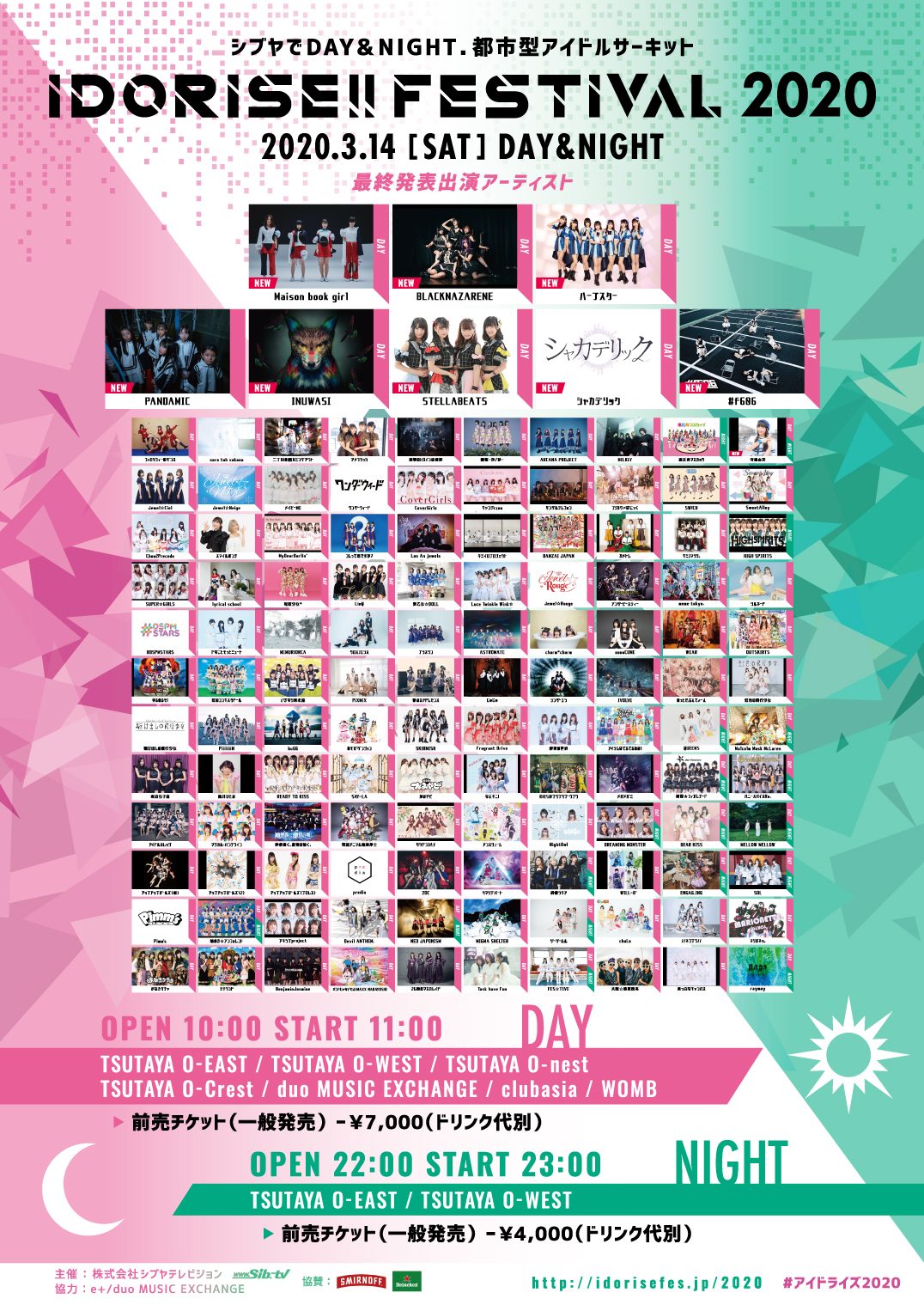『IDORISE!! FESTIVAL 2020』はシブヤテレビジョンが主催するイベントで、DAYとNIGHTの2部構成。DAY公演の最終出演者発表として、Maison book girl、BLACKNAZARENE、ハープスター、PANDAMIC、INUWASI、STELLABEATS、シャカデリック、#f606の8組が追加された。また、寺嶋由芙のDAY公演出演も決定。この最終発表をもって、DAYは全126組、NIGHTは全18組の出演者が出揃った。