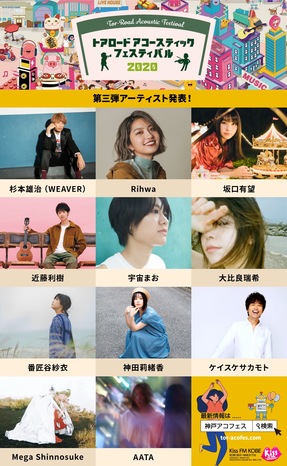 4月12日(日)に神戸三宮・元町の旧小学校、元キャバレー、カフェ、ライブハウス等で開催されるKiss FM KOBEが主催するライブサーキット・イベント『トアロード・アコースティック・フェスティバル2020』の第三弾出演アーティストが発表された。