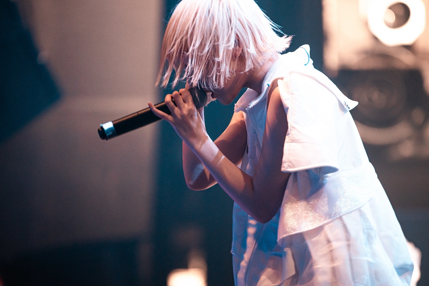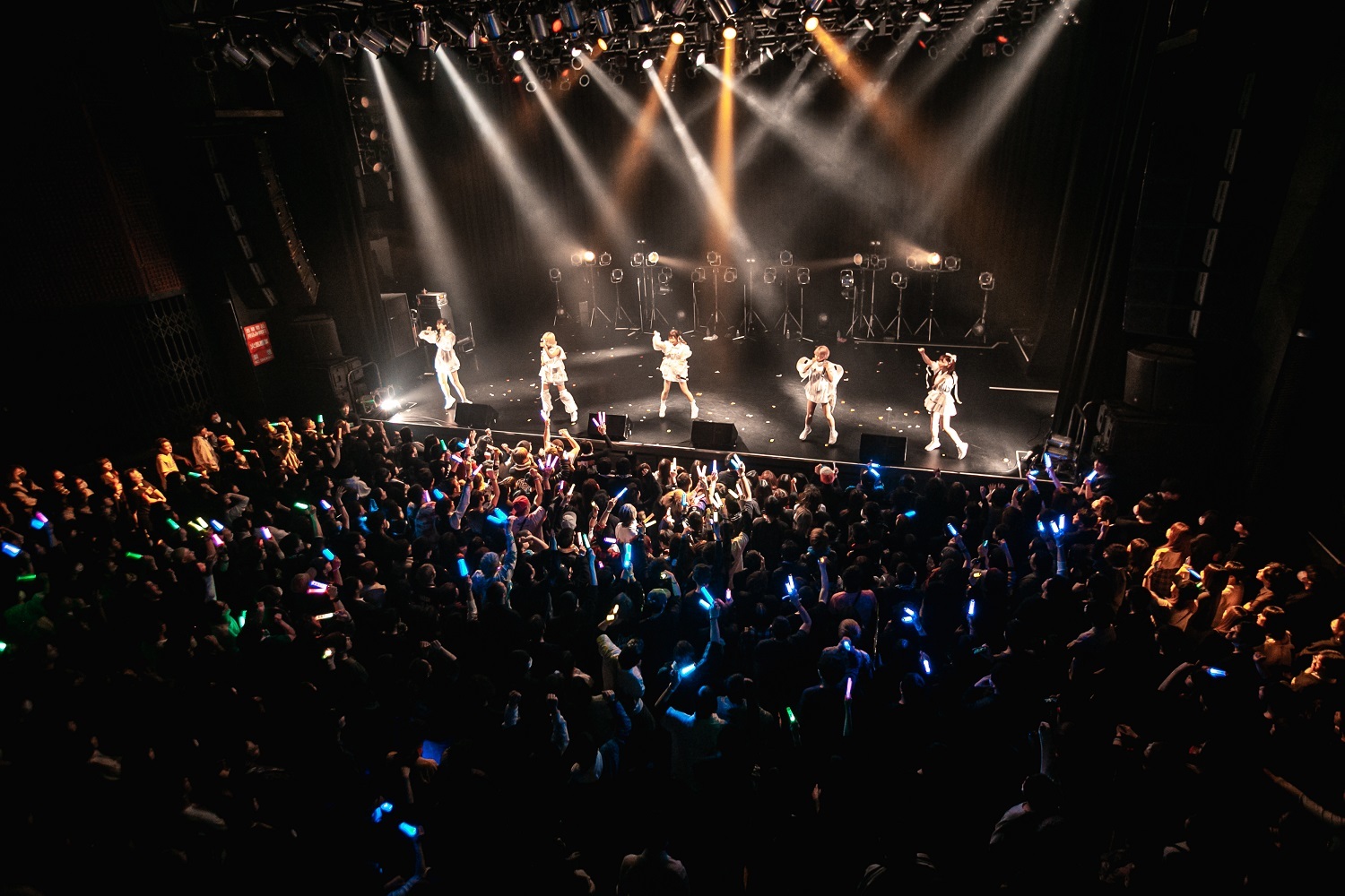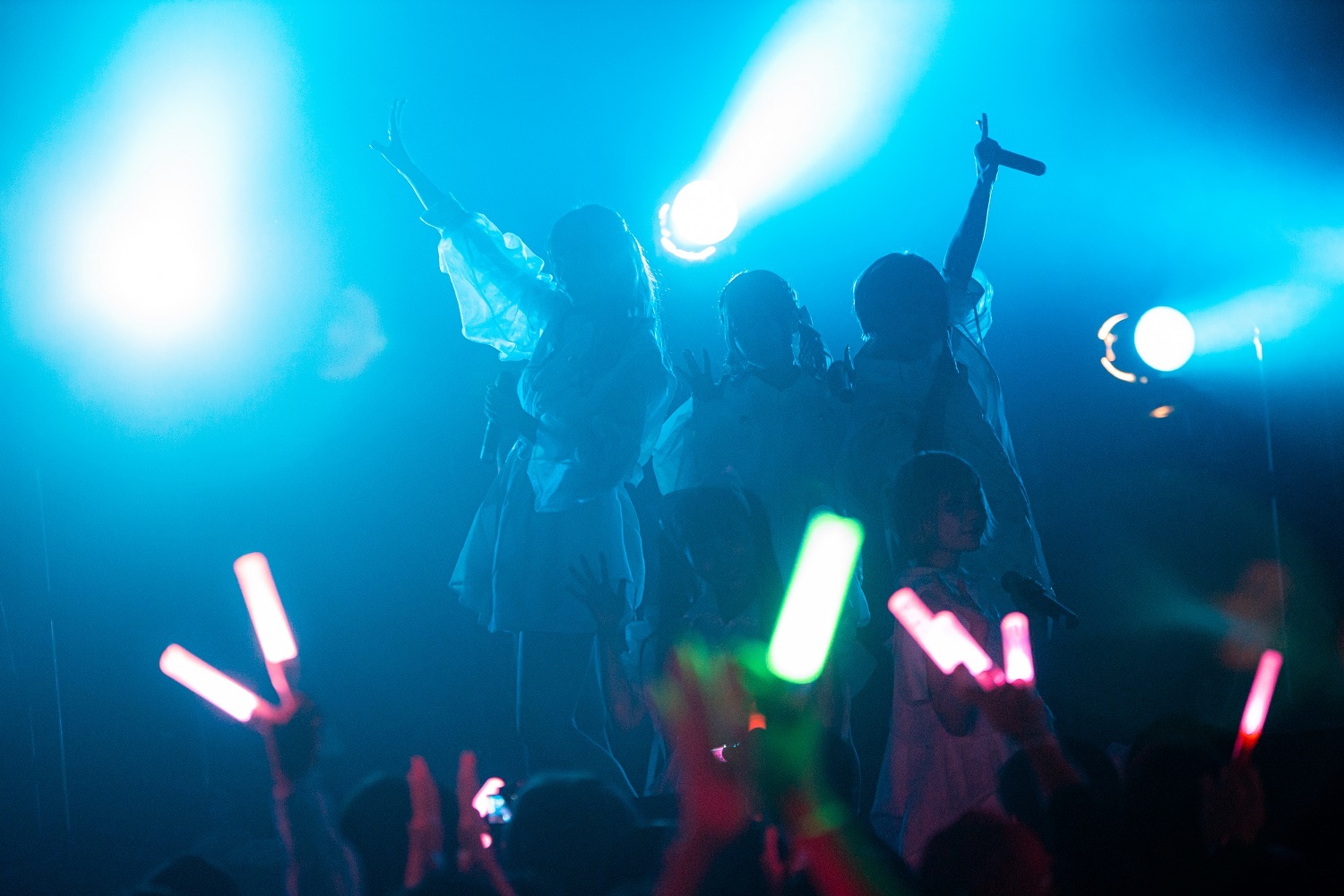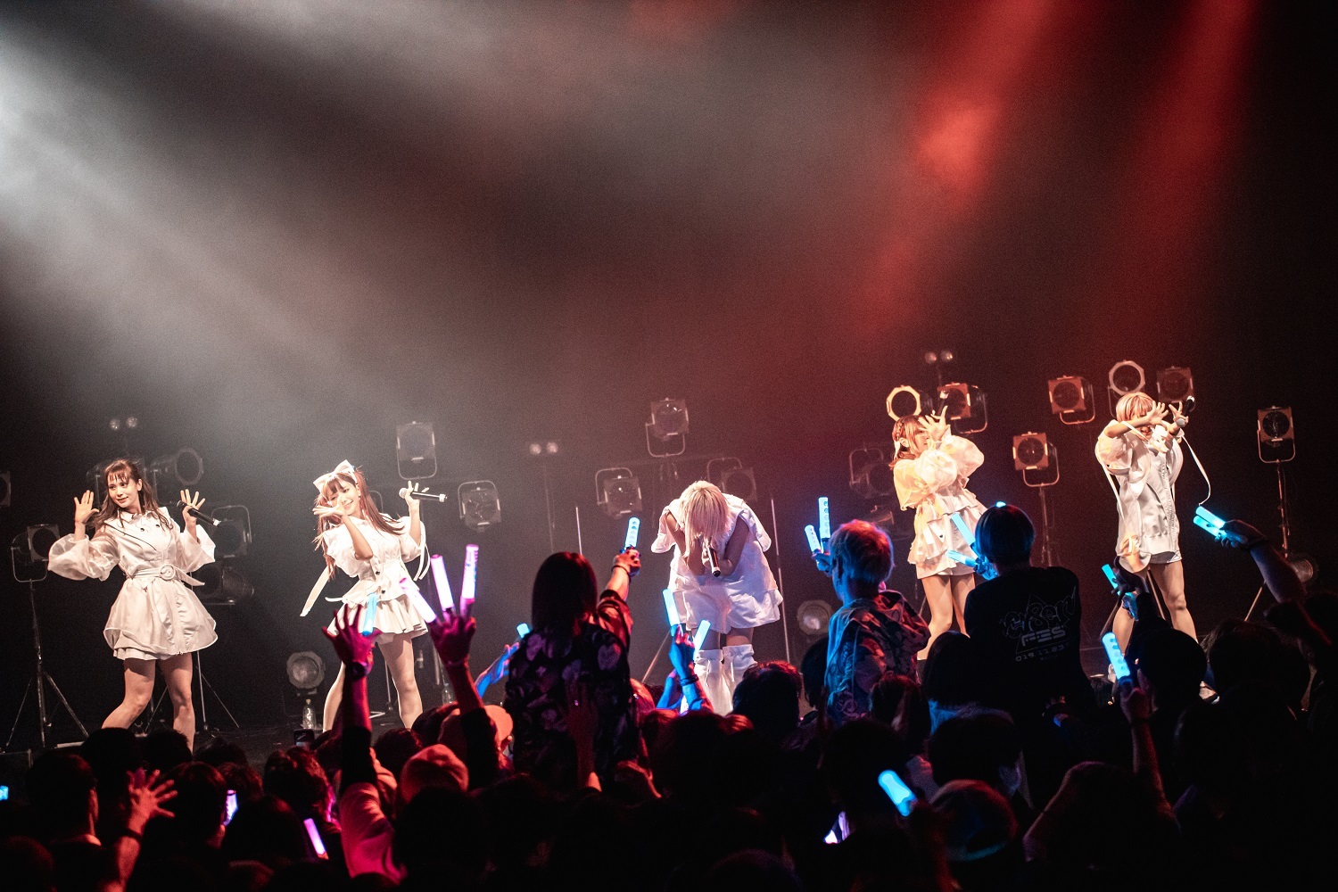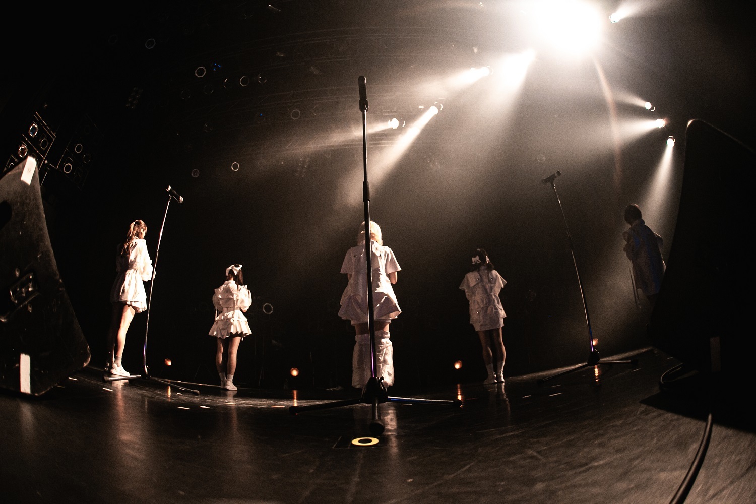 そのままメンバー名のコール&レスポンスを繰り広げる「MCMC DANCE」に繋ぎ、フロアを熱く盛り上げると、一転、「雨の渋谷駅、一人煙草をくわえて佇む15歳の女の子がいました」という、苺りなはむの一言から始まったのは「東京少女」。夢心地な雰囲気ながらも、どこか寂しさも感じさせるミディアムチューンで、5人はマイクスタンドを使ったパフォーマンスを披露。アッパーなだけでなく、しっとりとした雰囲気でもフロアを魅了していた。