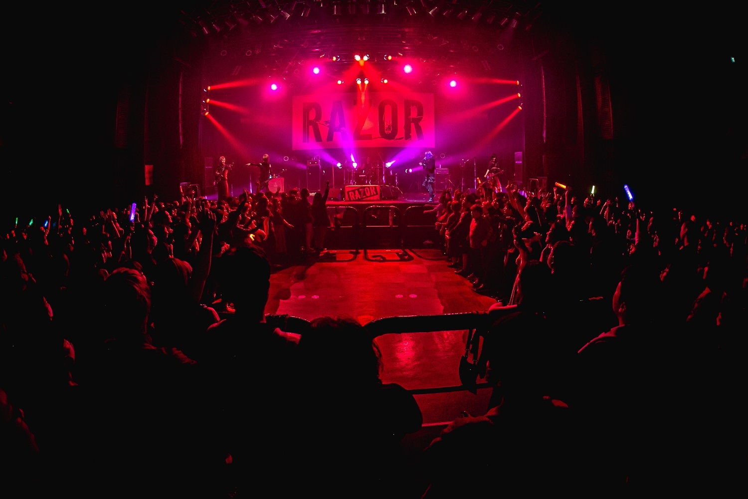 続いて登場したRAZORは、サポートドラマーにNatsu(NOCTURNAL BLOODLUST)を迎えた編成でのステージとなった。SEの「KNOT INVISIBLE」が流れる中、5人が姿を現わすと、フロアから怒号にも似た歓声があがる。各自が持ち場につき、バンド演奏に切り替えた途端、強烈な音塊がフロアを襲い、オーディエンスのヘッドバンギングが嵐のように吹き荒れた。