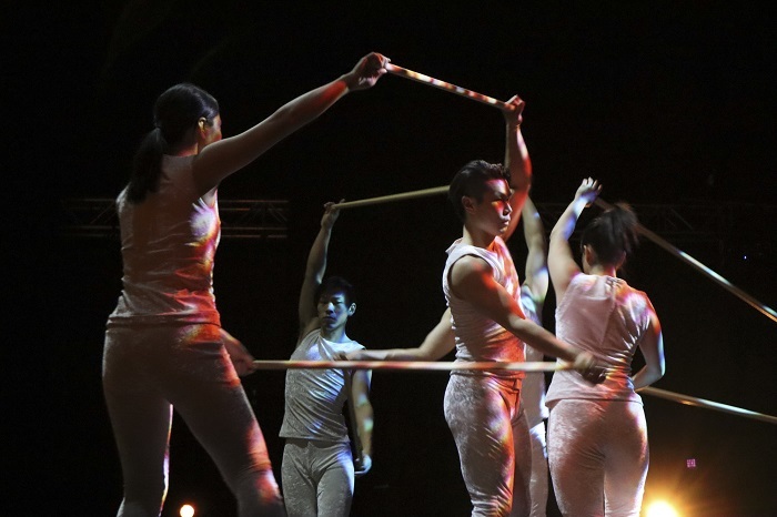 人間が誕生し、コミュニティーを形成し、やがて利己主義的になり争いが生まれる様を描いたシーン。このシーンではロベールの強い希望により、鼓童で初めての「棒術」に挑戦している。未経験の「棒術」については、外部から合気道の先生を招いて動きを創作した。棒一つで様々な感情を表現しており、棒は「コミュニティー」において人と人をつなぐ儀式の道具、「争い」では武器となり、自分を守る一方で相手を傷つけるものとして、同じものが一つのシーンでいろいろな役割を持ち登場する。