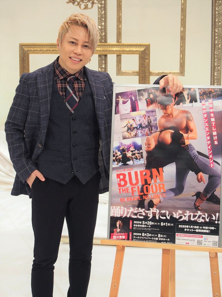 自身の楽曲「REAL×EYEZ」とのコラボレーションについての質問には、「『バーン・ザ・フロア』のステージを初めて観たとき、ダンサーそれぞれに得意なステップがあって個性も違う……。世界中から特殊な能力を持つヒーローを集めた、アベンジャーズみたいな集団だなと思った。今回『仮面ライダーゼロワン』という令和第1作目となる仮面ライダー作品の主題歌をやらせていただいているのですが、彼らにぴったりだと思って提案させていただきました」と経緯を紹介。そんな外国人ダンサーたちとの競演については、「体格の大きいダンサーもいれば小さい人もいるが、ダンサーたちに見劣りしないよう意識したい。世界中を飛び回っているカンパニーなので、公演終了後に、“西川は良かったな。これからも一緒にやりたいな”と思ってもらい海外公演に呼んでもらえたら嬉しい。そう言ってもらえるよう頑張りたいですね」と語った。