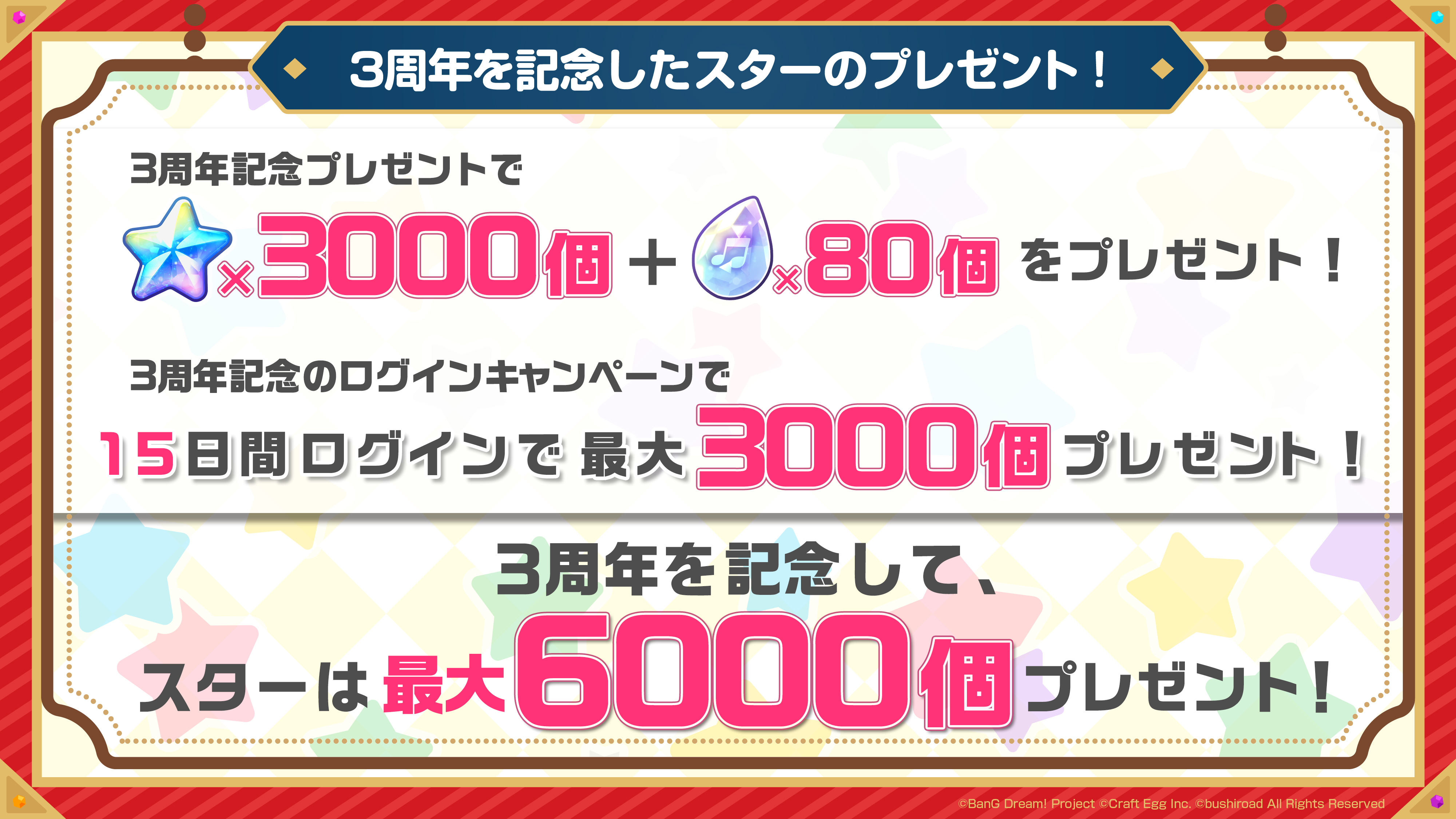 3月16日(月)0時より、キャンペーン開催期間中にログインすることで、合計「スター×3000」をプレゼントする「3周年記念プレゼント!」を実施。また、同日4時より、キャンペーン開催期間中、15日間ログインすることで最大「スター×3000」をプレゼントする「3周年記念ログインキャンペーン!」を開催。