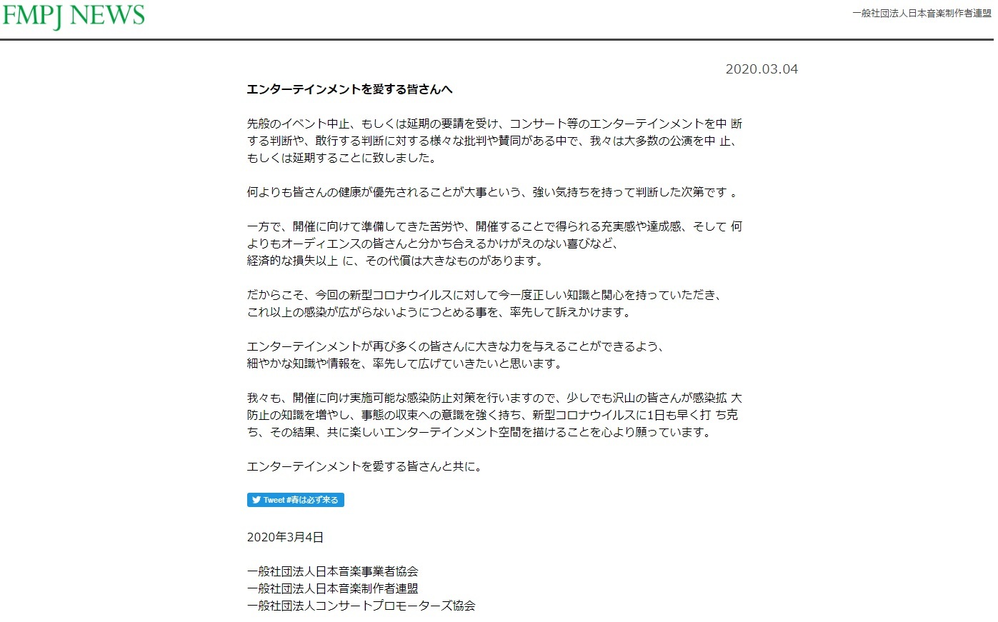 一般社団法人日本音楽事業者協会、一般社団法人日本音楽制作者連盟、一般社団法人コンサートプロモーターズ協会のエンターテインメント関連3団体は、新型コロナウイルス感染拡大の防止を呼びかけるため、「エンターテインメントを愛する皆さんへ」と題する声明文を発表した。