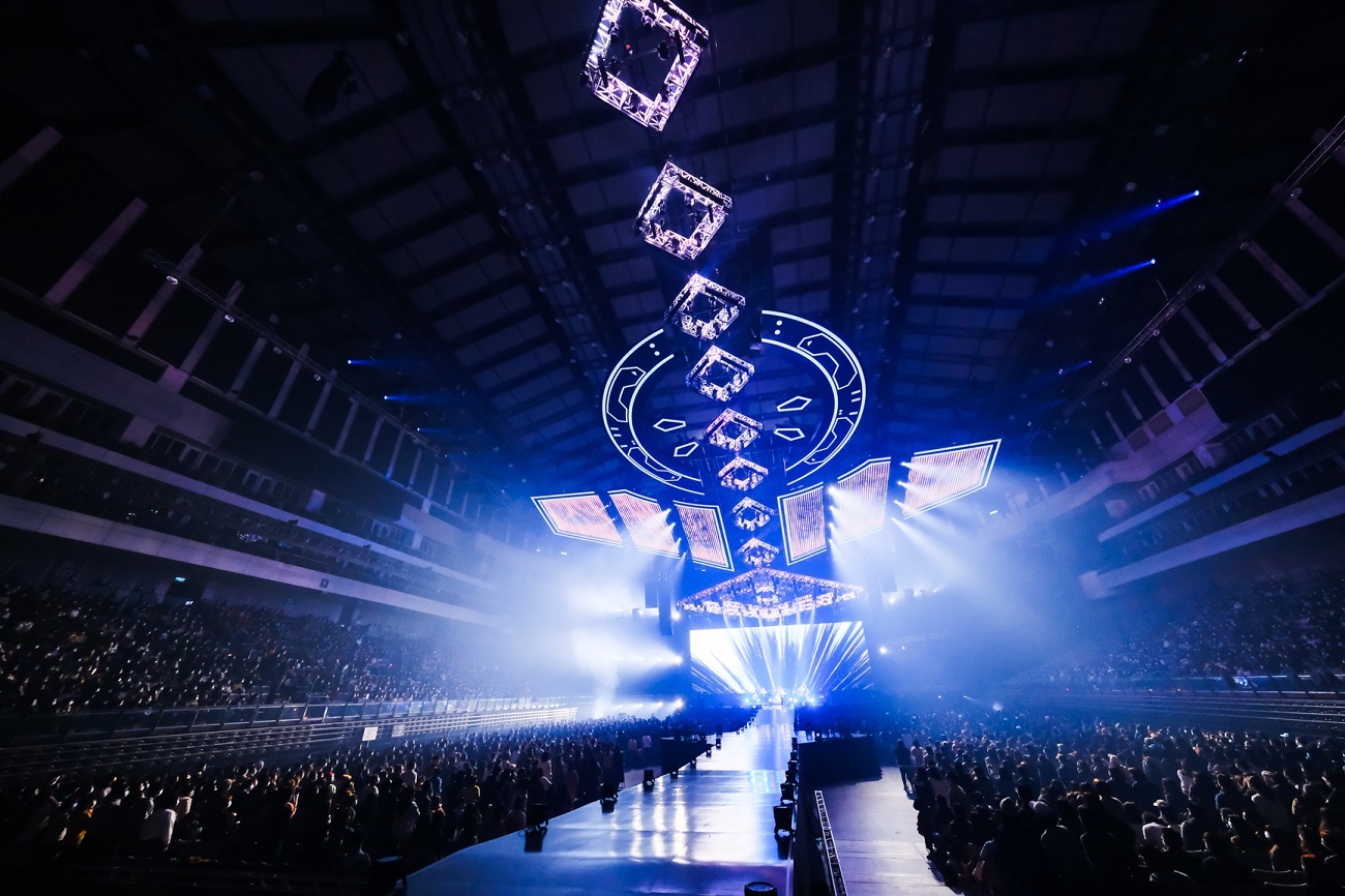 会場に入ると、ひし形のメイン・ステージから長い花道がまっすぐ伸びており、花道の上にはずらりと照明が連なっていた。中央には電飾でかたどられた巨大な翼が存在感を放っている。開演予定時刻の1分前に会場が暗転すると、まるで観客全員が宇宙船の中にいるかのような映像とSEが流れ出し、間も無くスタートするライブへの期待が更に高まったところで、ステージの下からゆっくりと3人がせり上がりで登場。会場が割れんばかりの歓声に包まれ、記念すべき初の台北アリーナ公演は彼らの初期の代表曲「一起去跑步/一緒に走ろう」からスタートした。