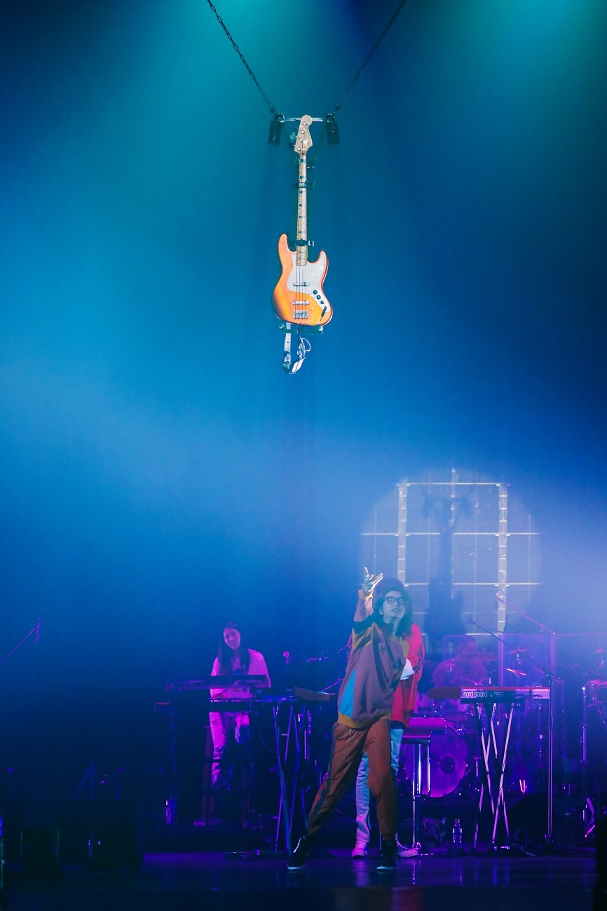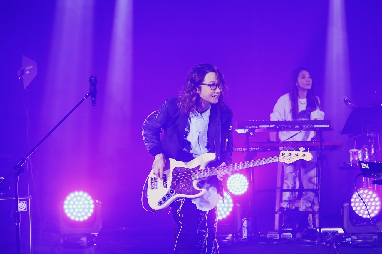 ライブがクライマックスに近付く中、メイン・ステージの一部分がぐんぐんせり上がり、そこで力のこもったギター・ソロを披露した阿奎。方Qは、ファンキーなディスコ・サウンドに乗って天井からステージに向かって降りてきたベース————この日初披露の、日本で手に入れたオレンジ色のフェンダー「ジャズベース」————で、スラップ炸裂のソロを弾きオーディエンスを魅了した。