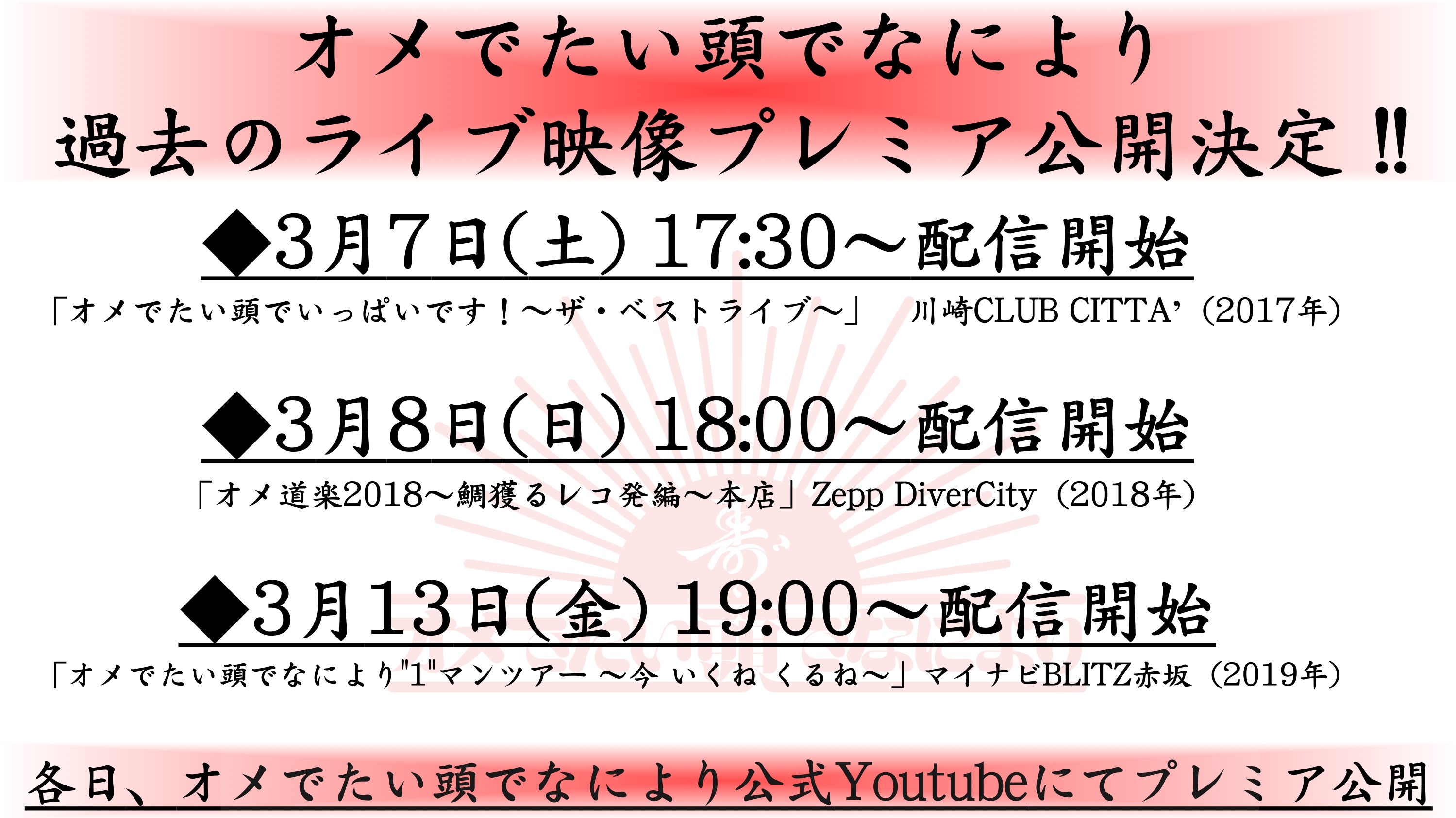 オメでたい頭でなによりが、過去のライブ映像3作品を期間限定でYoutubeプレミア公開することを発表した。