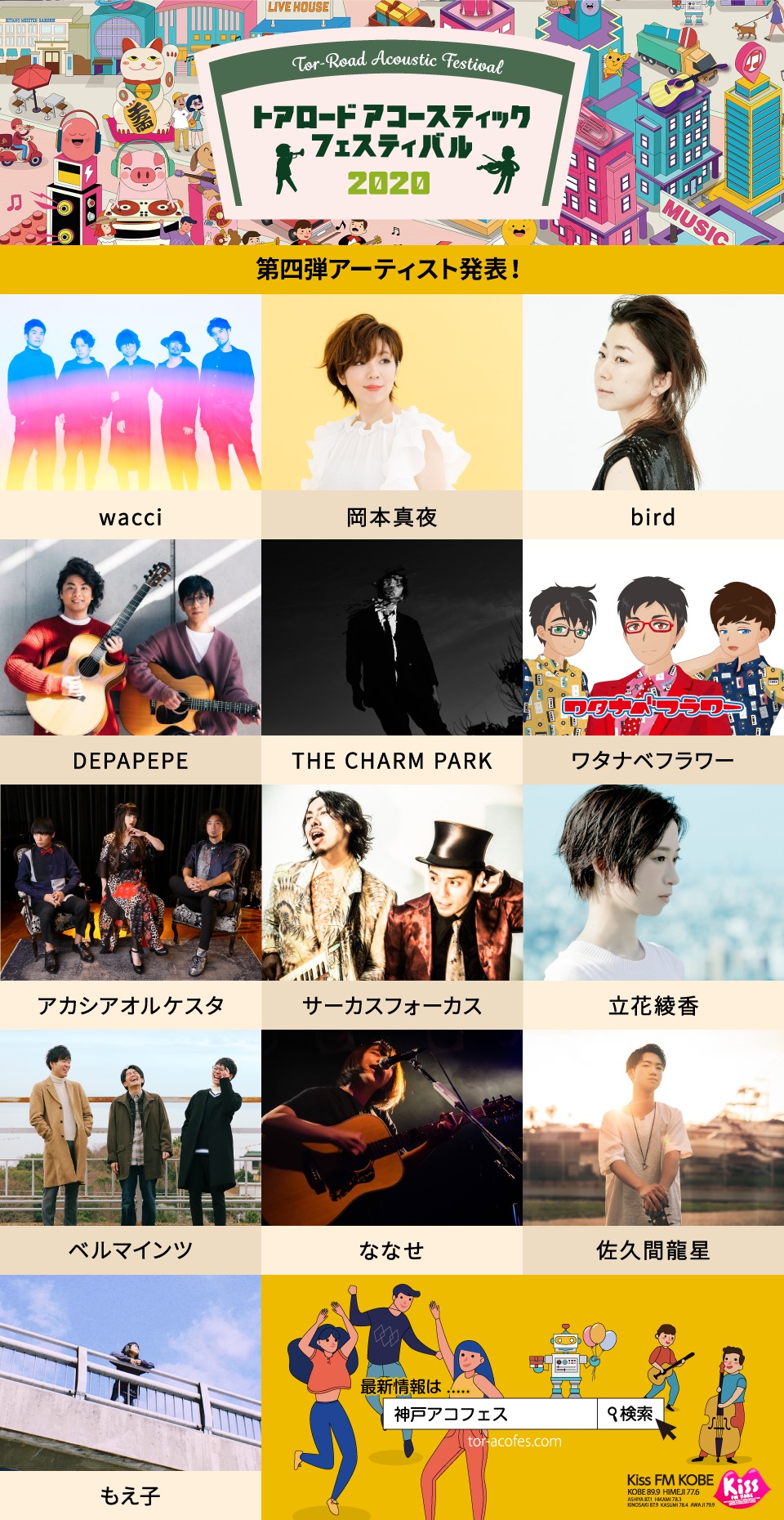 4月12日(日)に神戸三宮・元町の旧小学校、元キャバレー、カフェ、ライブハウス等で開催されるKiss FM KOBEが主催するライブサーキット・イベント『トアロード・アコースティック・フェスティバル2020』の第四弾出演アーティストが発表された。